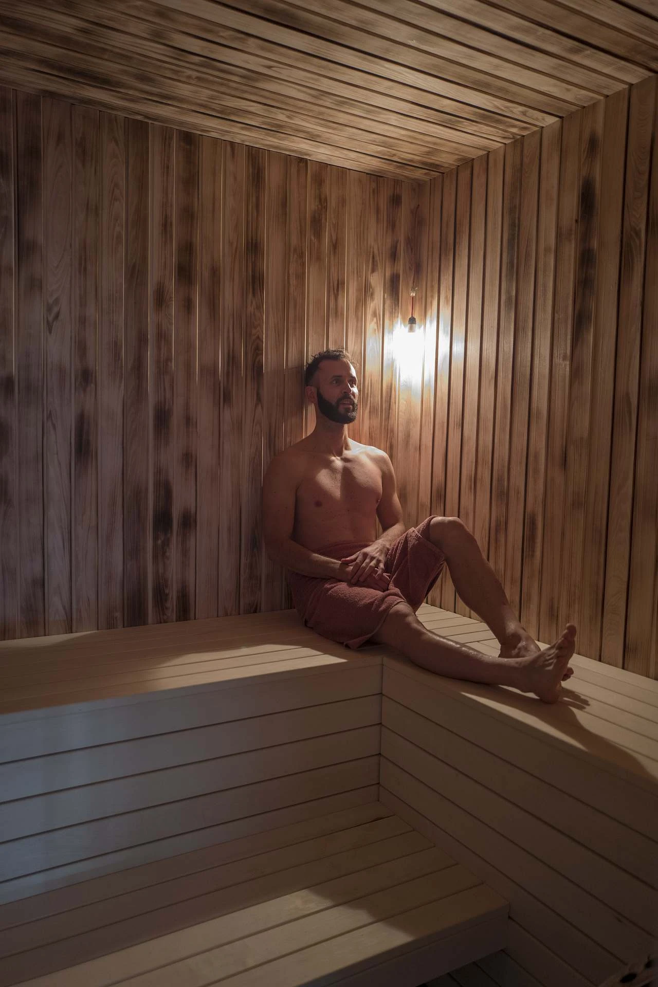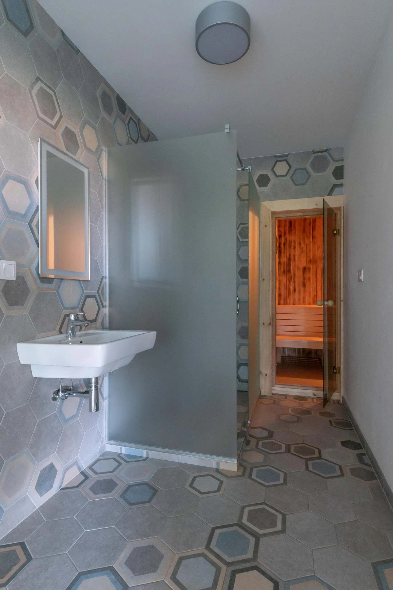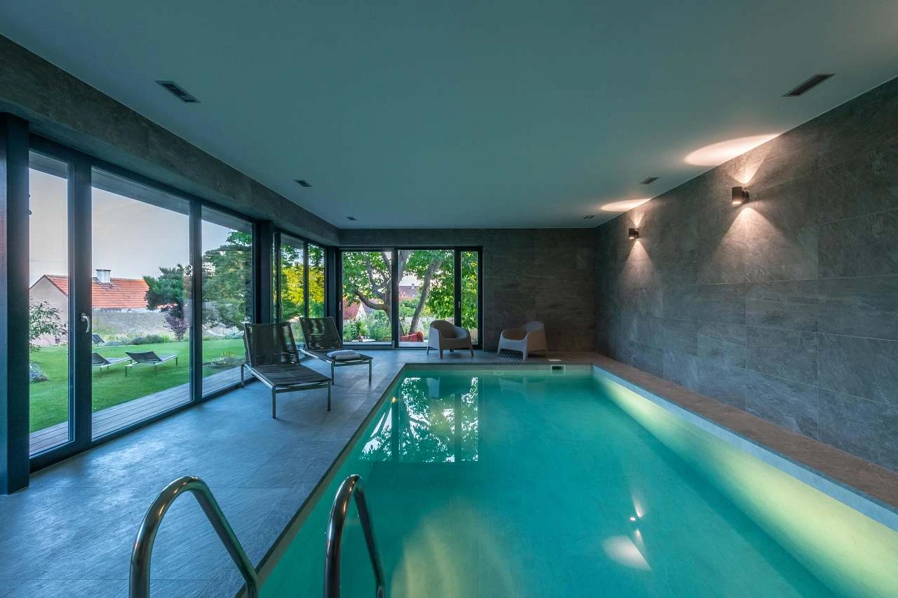 Vnitřní bazén s protiproudem a sauna jsou přístupné bez omezení všem hostům. Z prostoru bazénu je vstup na dřevěnou terasu.