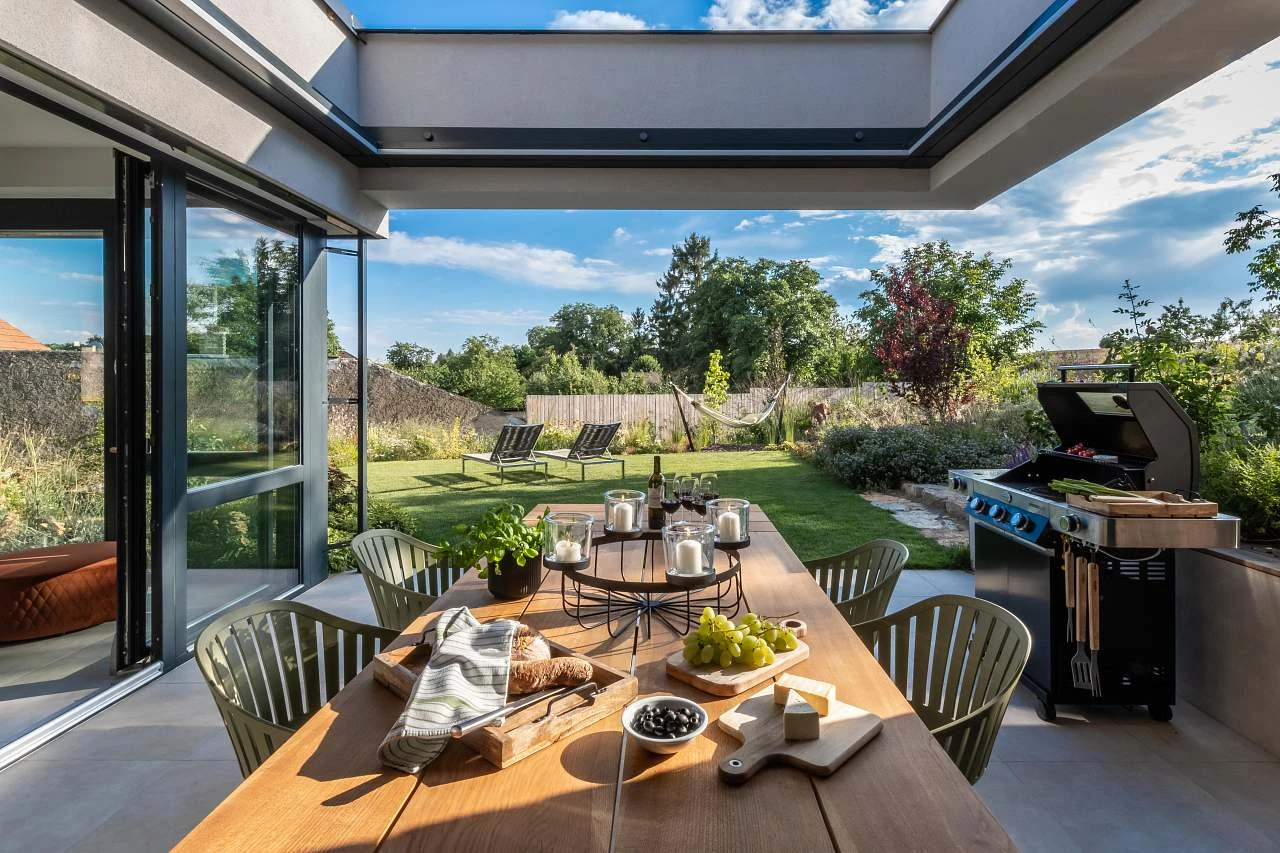 Zastřešená terasa s prostorným stolem pro 12 - 14 osob, gril, ohniště, velká terasa u stodoly.