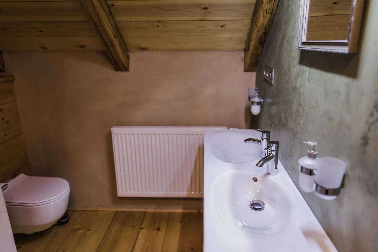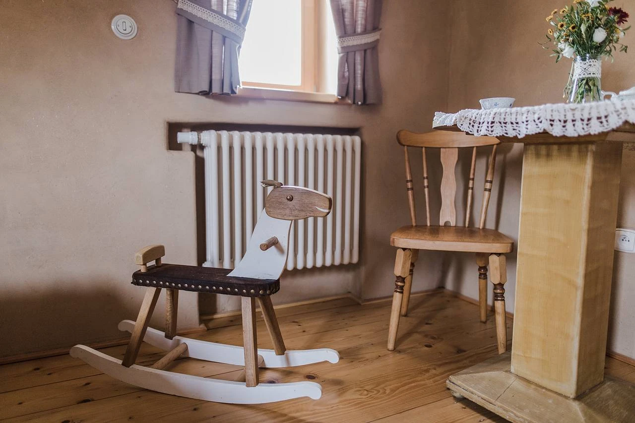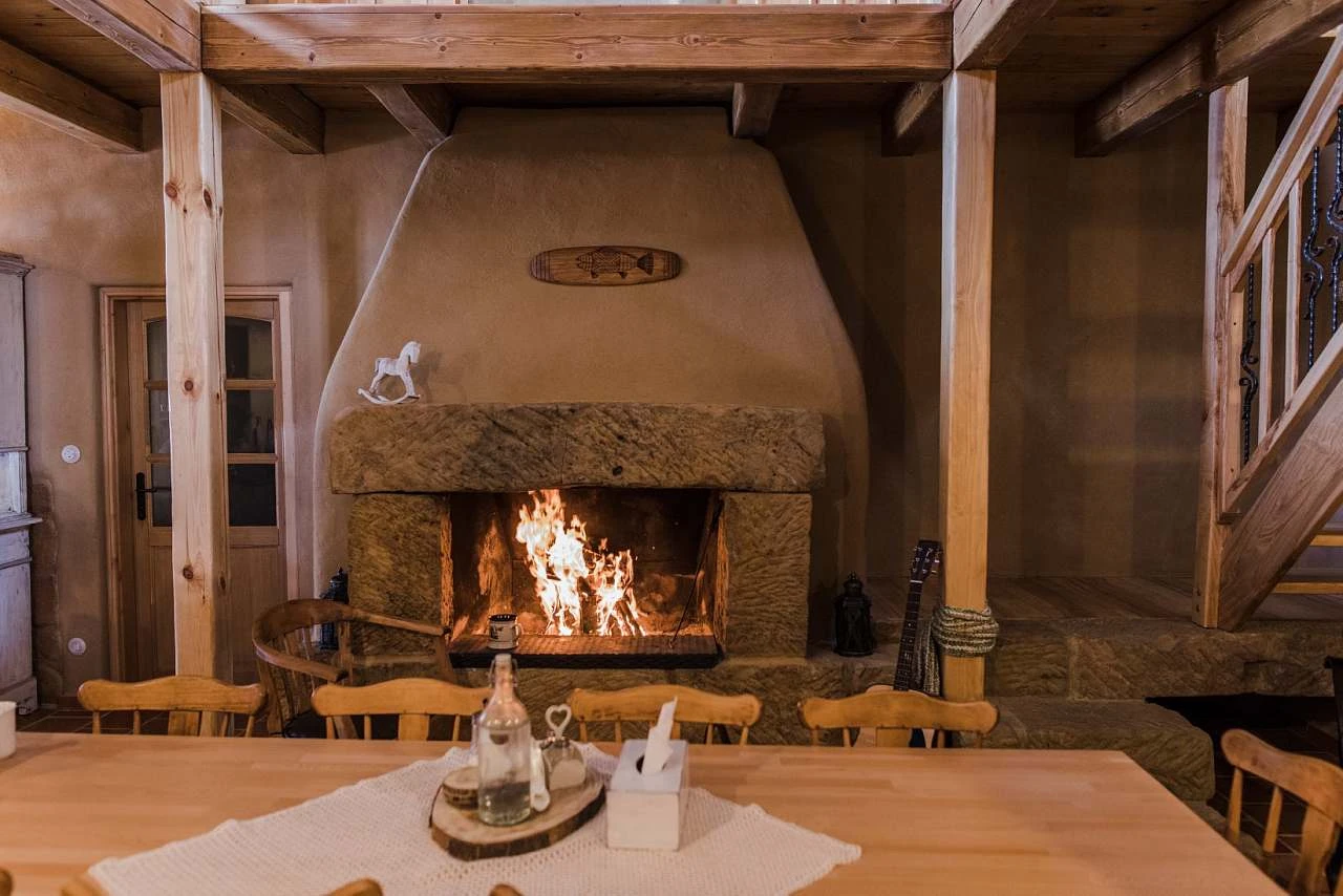 Stejně jako v celé chalupě i zde najdete dominující přírodní materiály, původní trámy, dřevěnou podlahu a hliněné omítky. Hliněné omítky jsou čistě přírodním materiálem, složený z jílů, písku a řezanky. Ocení je nejen ten, kdo miluje dotek přírody, ale i lidé s respiračními potížemi a alergiemi.