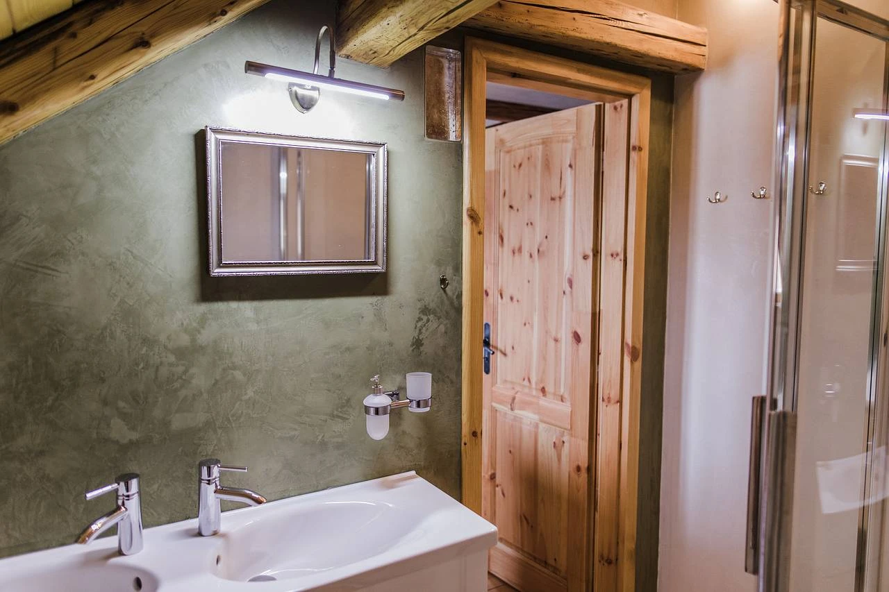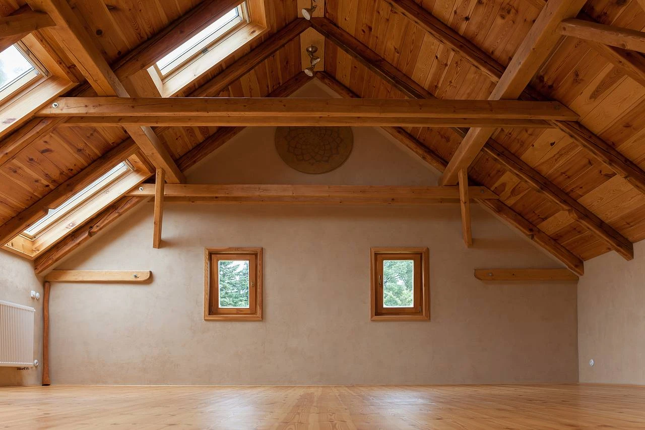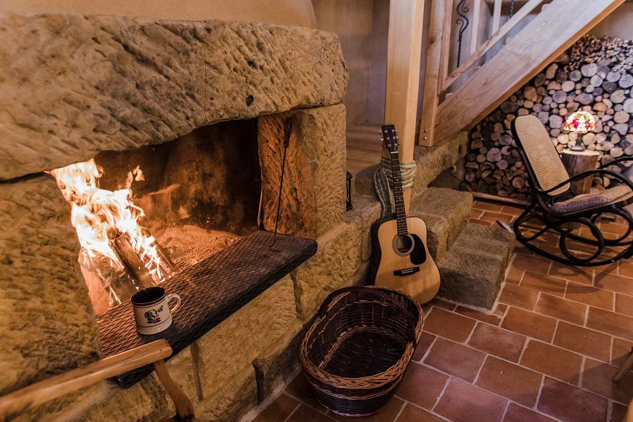 Stejně jako v celé chalupě i zde najdete dominující přírodní materiály, původní trámy, dřevěnou podlahu a hliněné omítky. Hliněné omítky jsou čistě přírodním materiálem, složený z jílů, písku a řezanky. Ocení je nejen ten, kdo miluje dotek přírody, ale i lidé s respiračními potížemi a alergiemi.