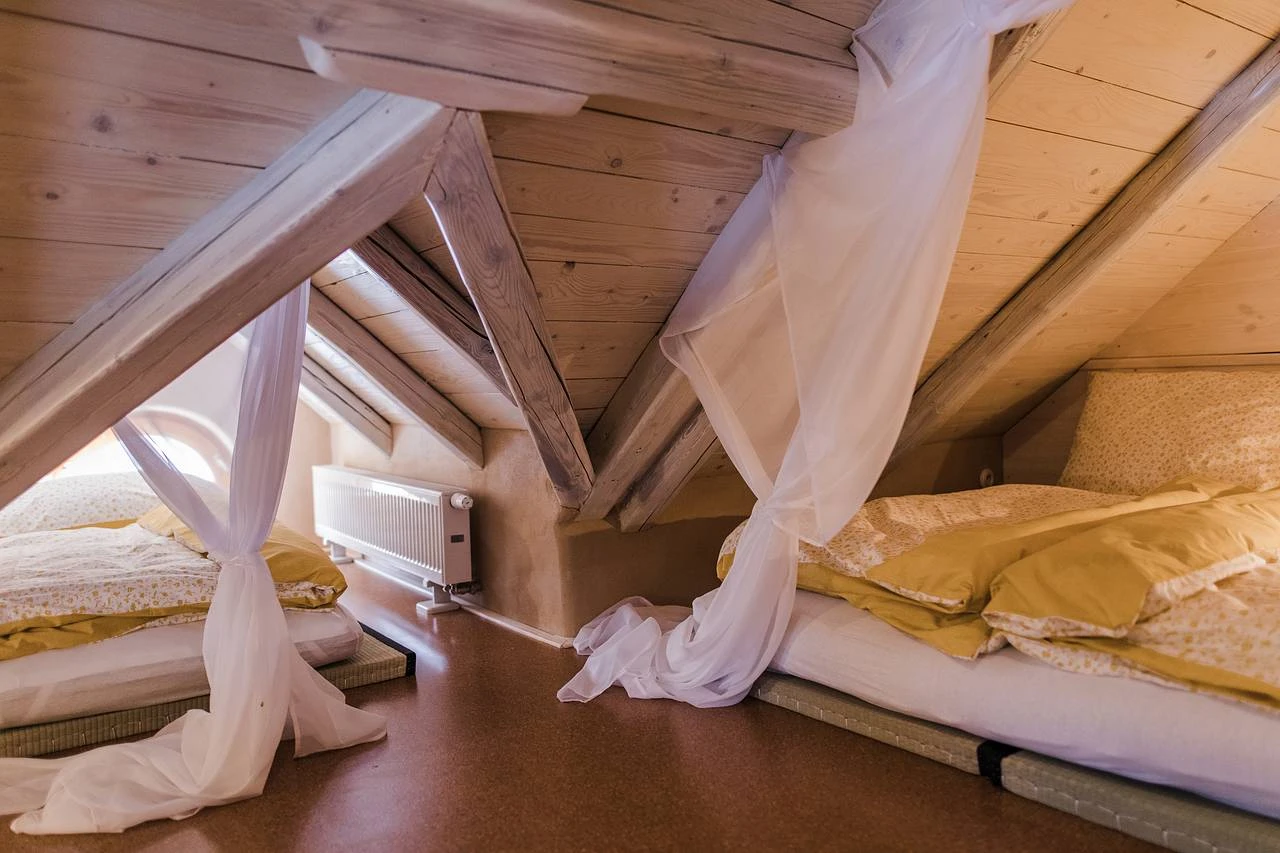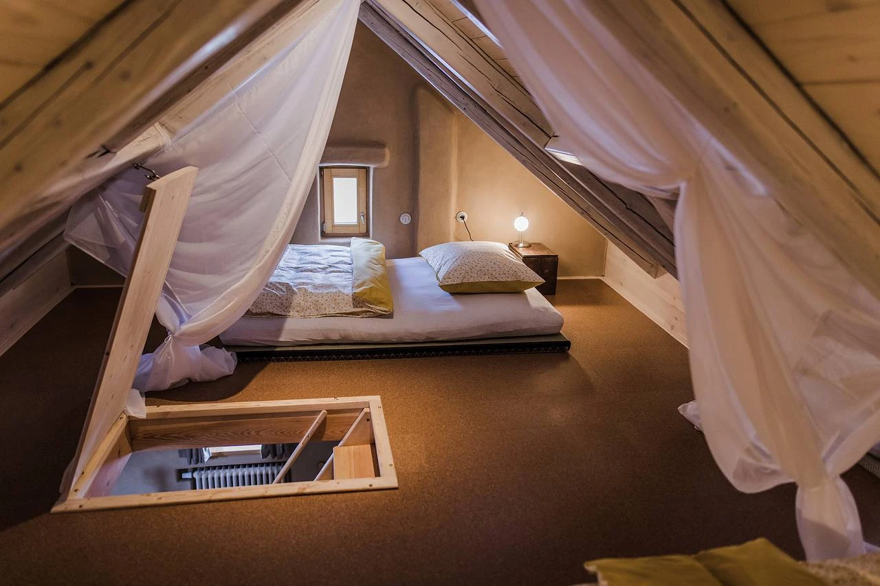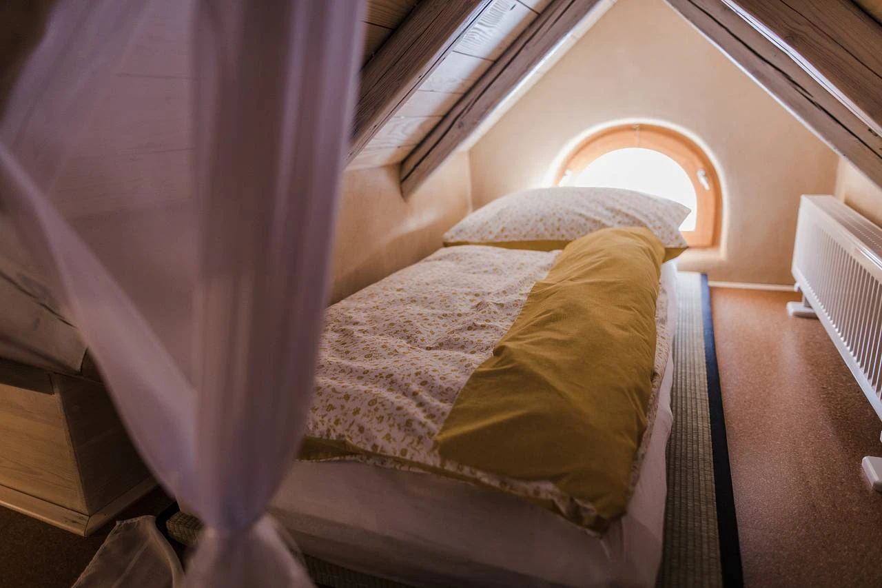 Rodinný apartmán se spaním v patře na japonských futonech. Součástí je vybavená kuchyňka s výhledem do zahrady, vlastní koupelna a samostatná toaleta. Stejně jako v celé chalupě i zde najdete dominující přírodní materiály, původní trámy, dřevěnou podlahu a hliněné omítky. Hliněné omítky jsou čistě přírodním materiálem, složený z jílů, písku a řezanky. Ocení je nejen ten, kdo miluje dotek přírody, ale i lidé s respiračními potížemi a alergiemi.