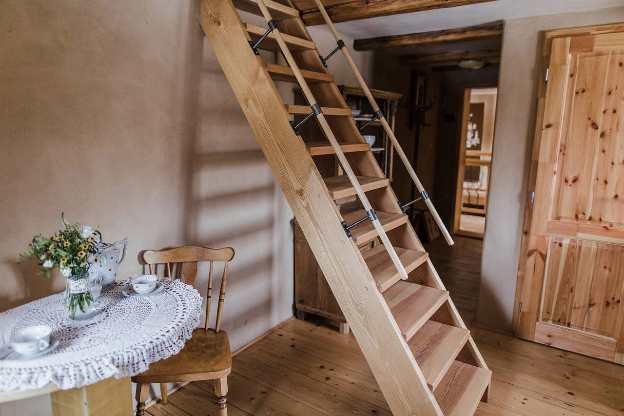 Rodinný, novomanželský, apartmán s nádherným výhledem do přírody. Apartmán je dvoupatrový, kde ve druhém patře je otevřený prostor s ložnicí a volně stojící vanou. Spodní část poskytuje také spaní, společný prostor k posezení a samostatnou koupelnu. Stejně jako v celé chalupě i zde najdete dominující přírodní materiály, masivní trámy, dřevěnou podlahu a hliněné omítky. Hliněné omítky jsou čistě přírodním materiálem, složený z jílů, písku a řezanky. Ocení je nejen ten, kdo miluje dotek přírody, ale i lidé s respiračními potížemi a alergiemi.