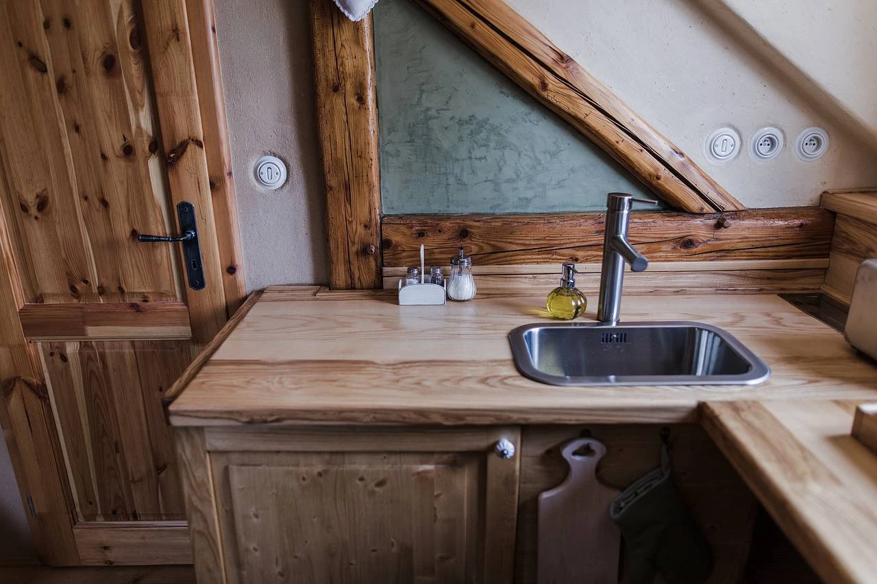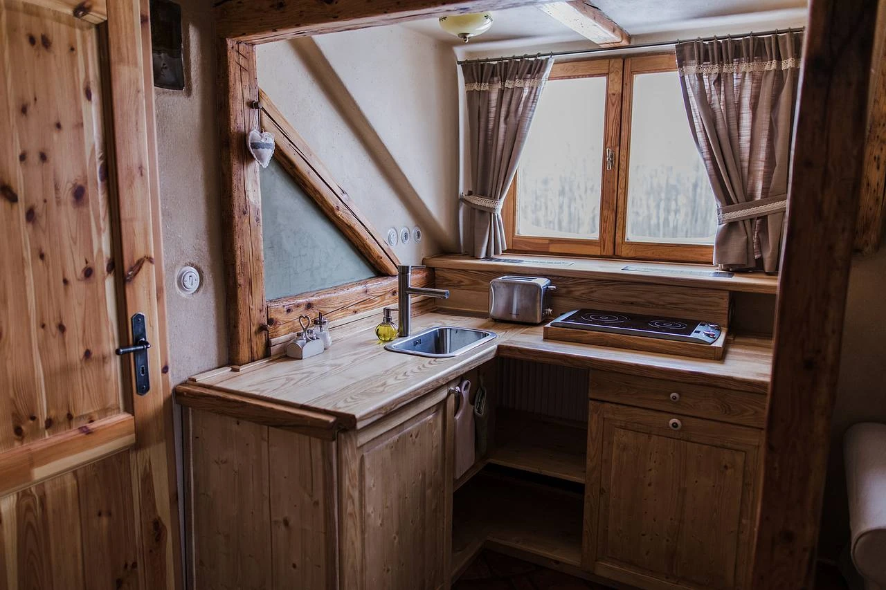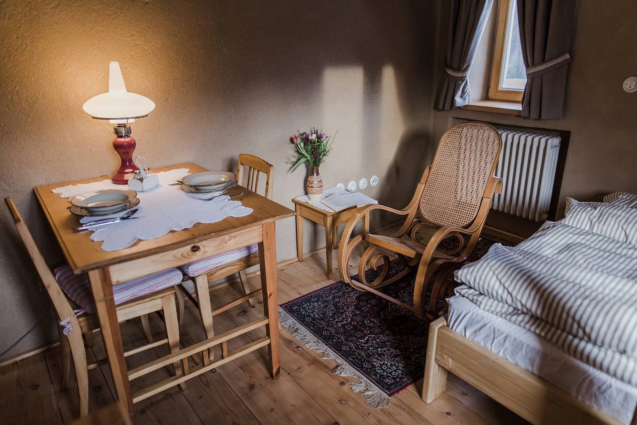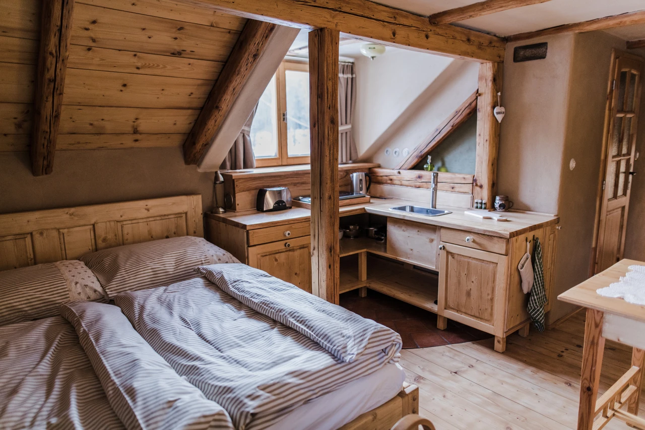 Dvoulůžkový pokoj s manželskou postelí, vlastní prostornou koupelnou a vybavenou kuchyňkou s výhledem do údolí. Do pokoje je možné přidat dětskou postýlku. Stejně jako v celé chalupě i zde najdete dominující přírodní materiály, původní trámy, dřevěnou podlahu a hliněné omítky. Hliněné omítky jsou čistě přírodním materiálem, složený z jílů, písku a řezanky. Ocení je nejen ten, kdo miluje dotek přírody, ale i lidé s respiračními potížemi a alergiemi.