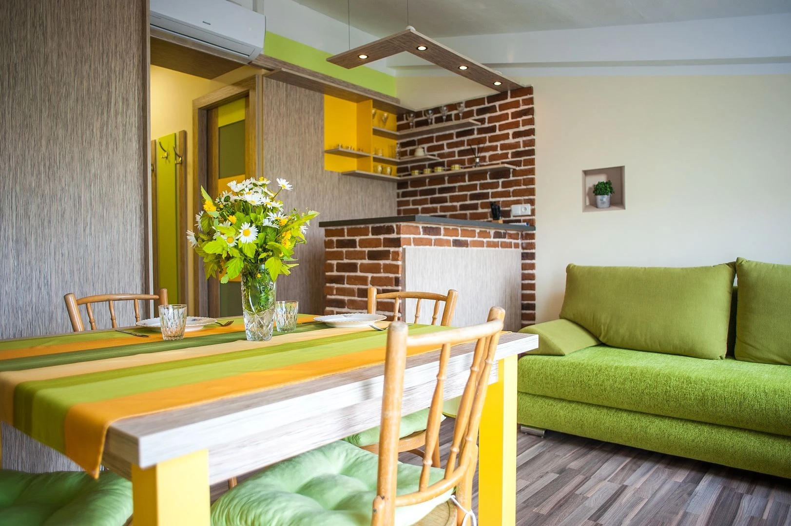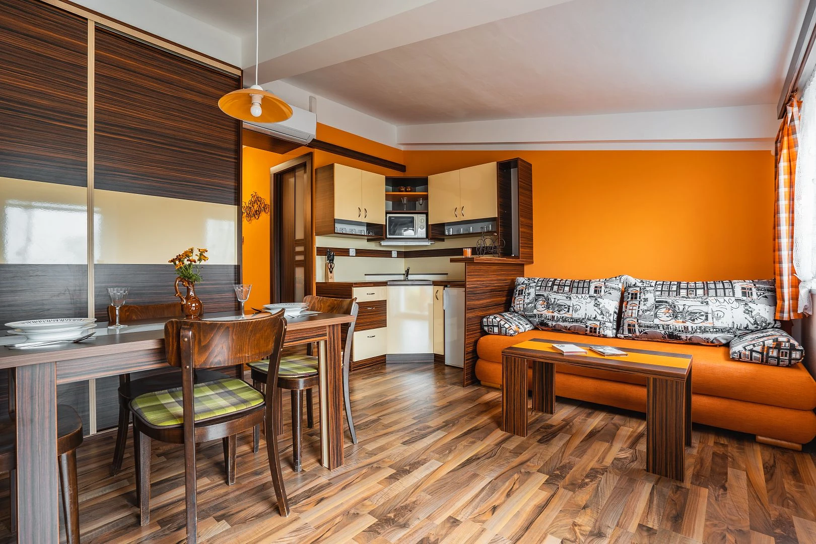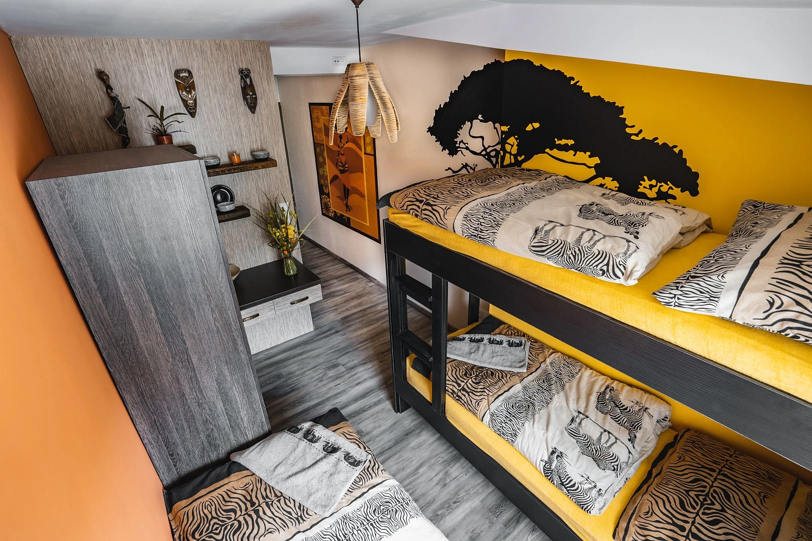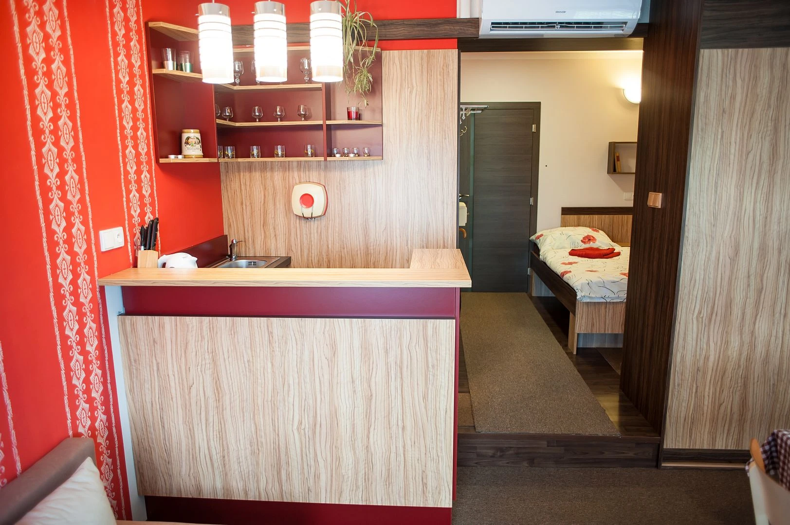 - Vybavení: Klimatizace, retro lednice, barový kout s dřezem, televize, terasa.