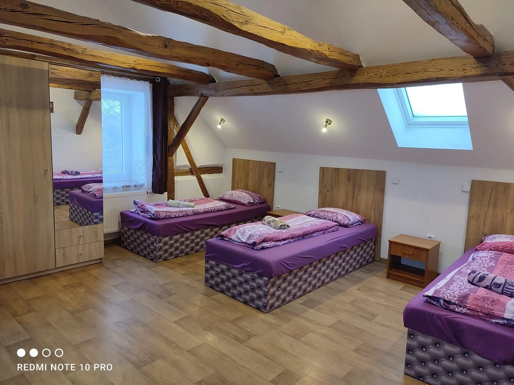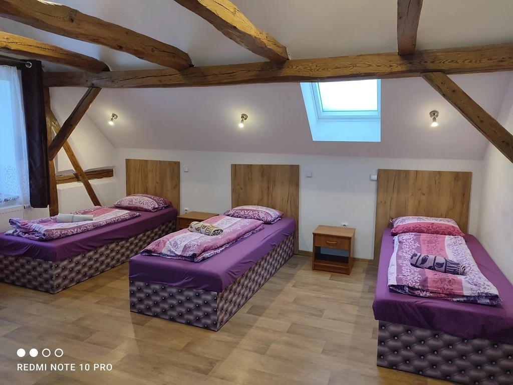 Velikost: 50 m² Umístění: 1. patro Ložnice: 3x Jednolůžková postel – Možnost spojit do dvojlůžka Vybavení: Balkon, Internet WiFi, Televize, Kabelová TV, Gauč Koupelna s toaletou Sprcha, Umyvadlo, Toaleta, Pračka, Sušák na prádlo, Ručníky Kuchyňský kout Elektrický vařič, Mikrovlnná trouba, Remoska, Rychlovarná konvice, Lednička, Mraznička, Televize, Jídelní sezení, Pračka