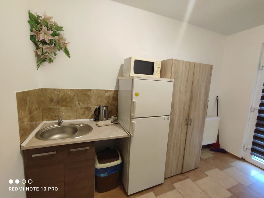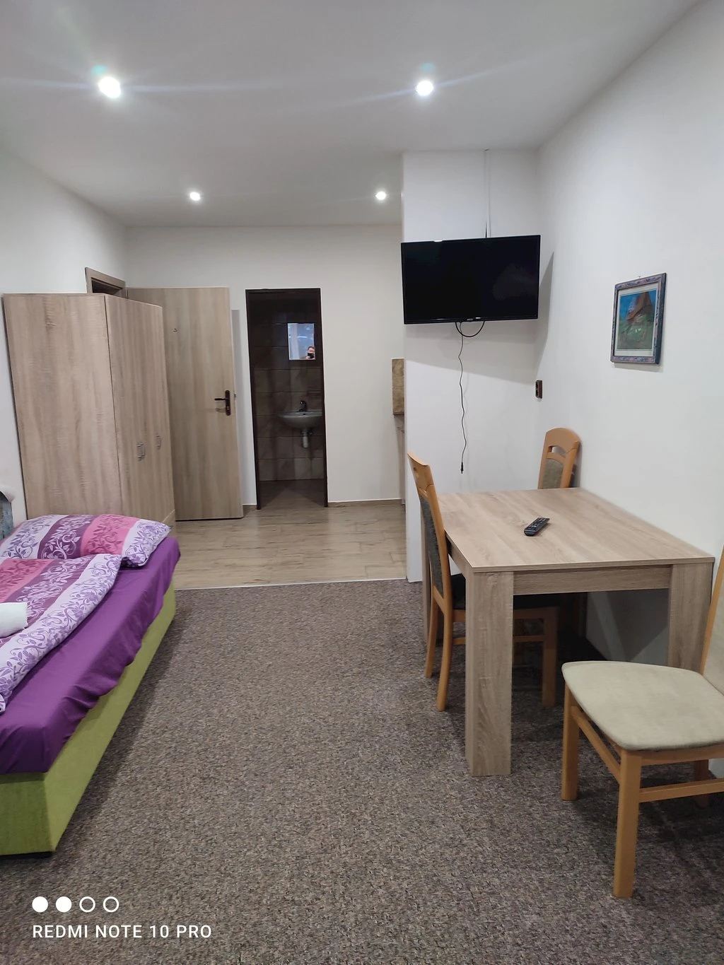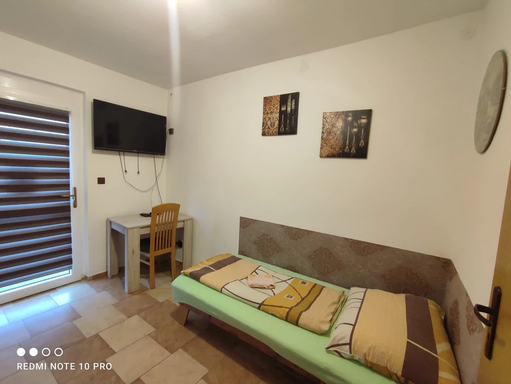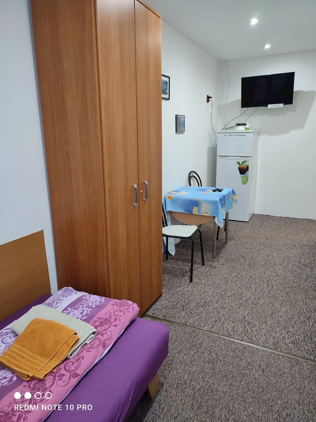 Velikost: 10 m² Umístění: přízemí Ložnice: 1x Jednolůžková postel Vybavení: Internet WiFi, Televize, Kabelová TV, Terasa, Soukromý vchod do budovy Koupelna s toaletou Sprcha, Umyvadlo, Toaleta, Ručníky Kuchyňský kout Mikrovlnná trouba, Rychlovarná konvice, Lednička, Mraznička, Jídelní sezení, Indukční varná deska