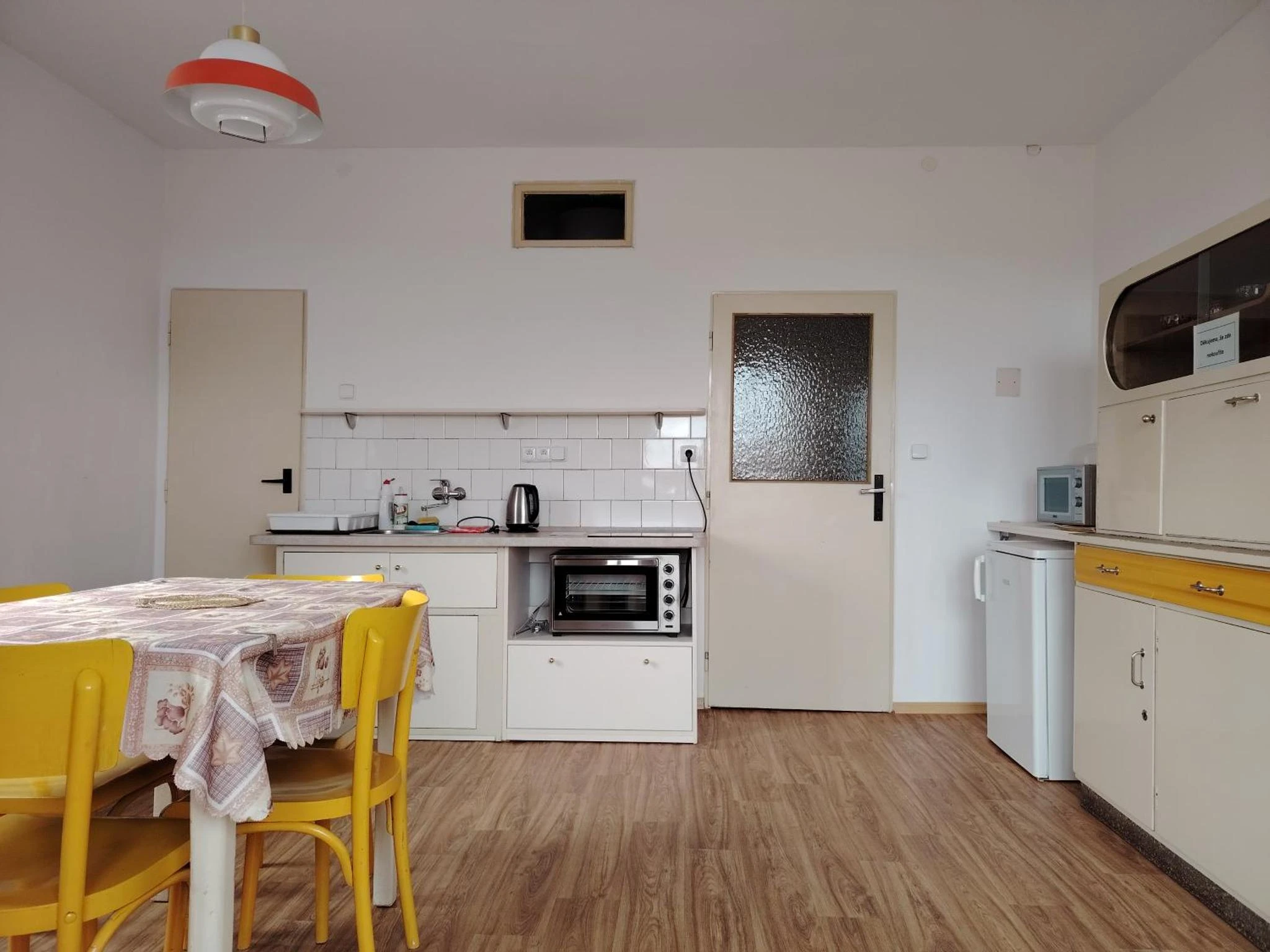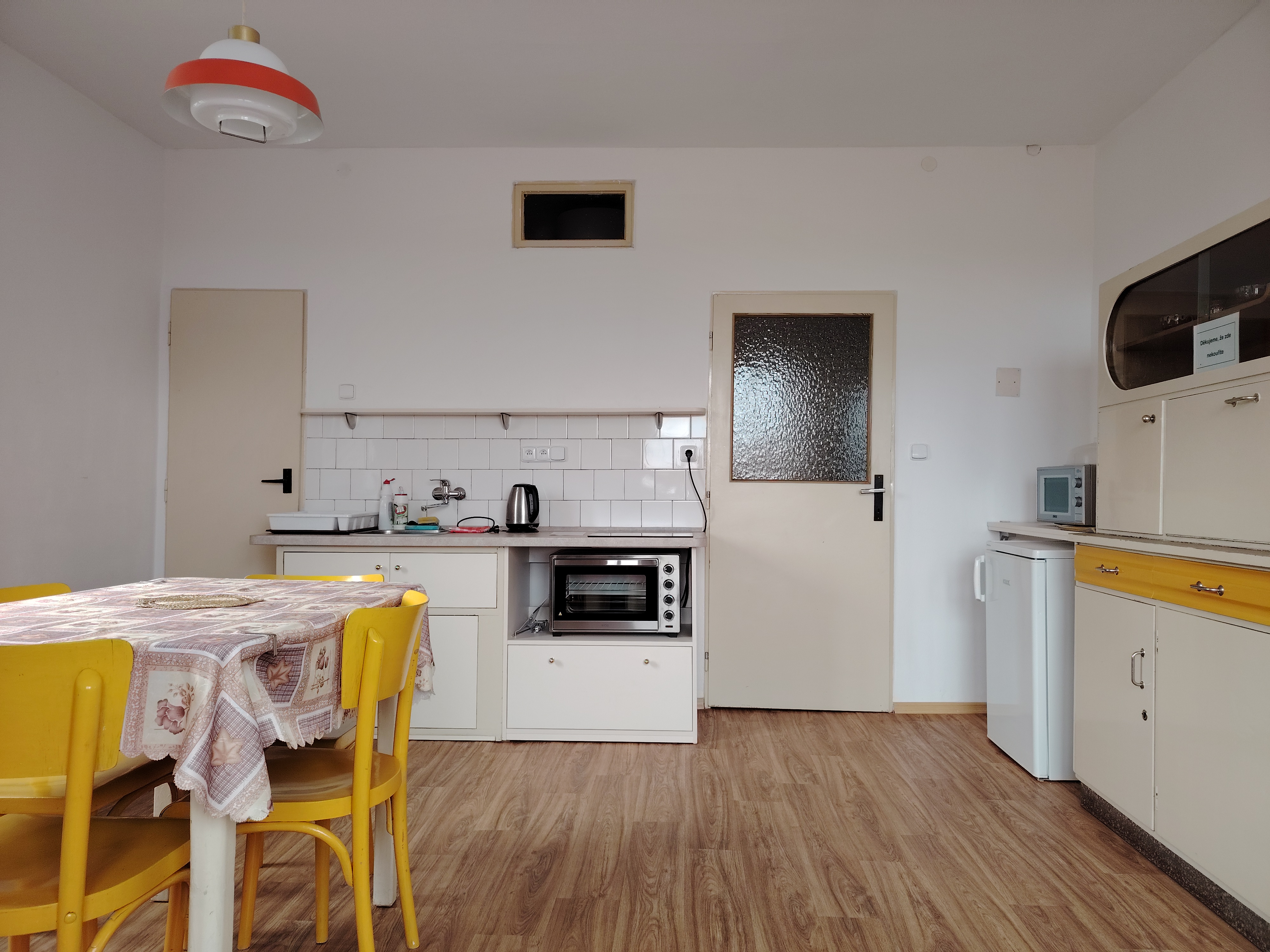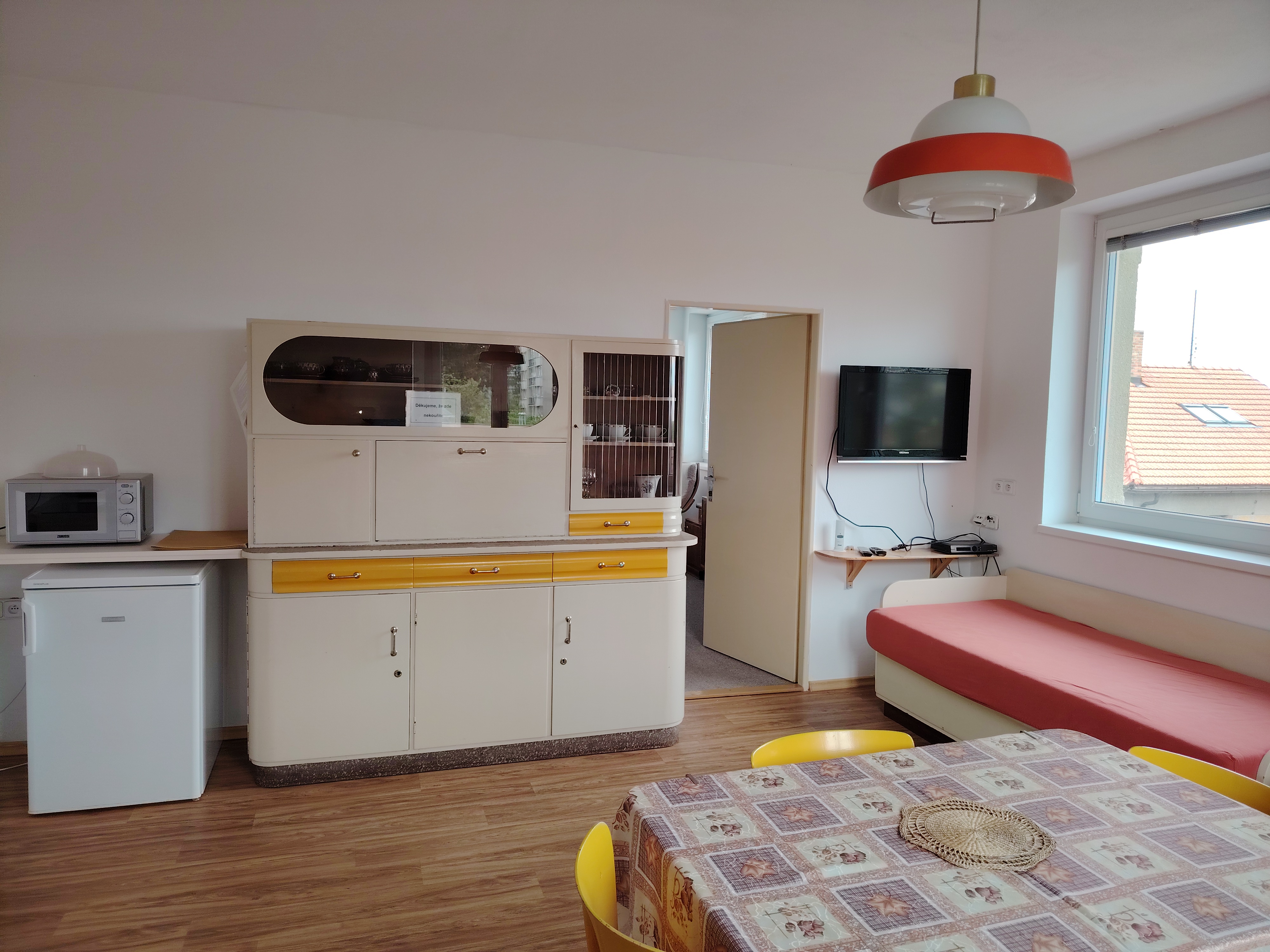 Byt 1+1, obytná kuchyň v retro stylu se dvěma "gauči" s kvalitními postelovými matracemi, pokoj se 3 lůžky.