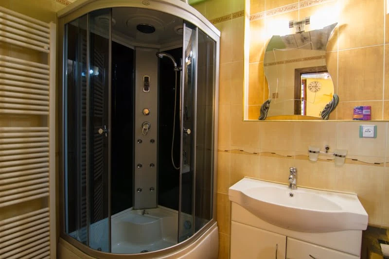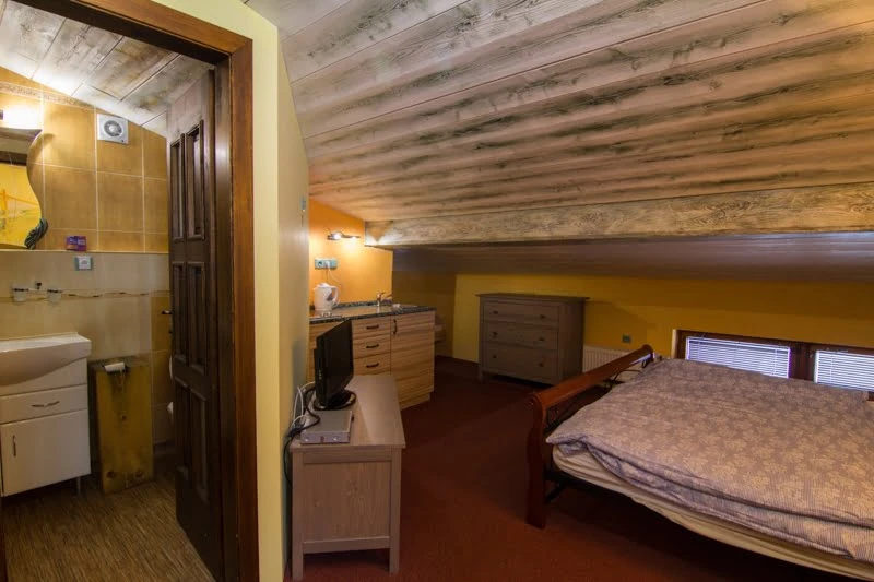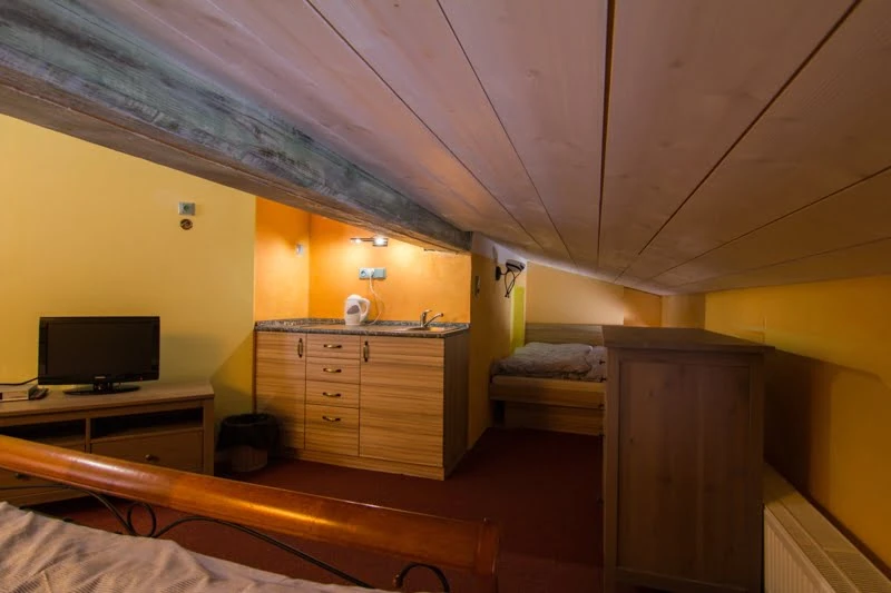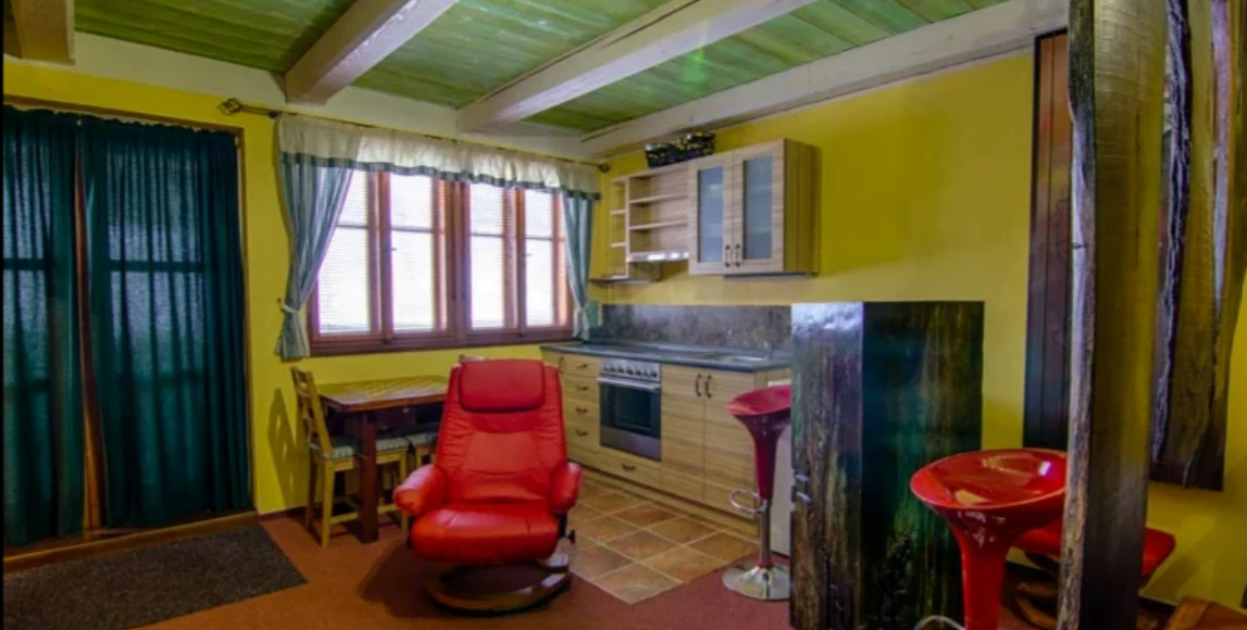 Studio č. 1 - 2× dvoulůžko (1× vhodnější pro děti i dospělé – snížený strop), ideální pro rodinu, kuchyňský kout (dvou plotýnka, mikrovlnka, varná konvice), TV, hydro-masážní sprchový kout, WC, umělecká výzdoba