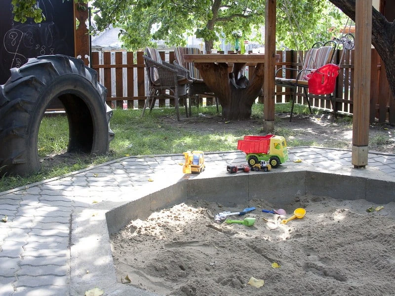 - pro děti pískoviště, domeček ve stromě, tabule na kreslení, trampolína, skluzavka, houpačka, hračky