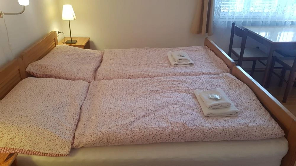 Šestilůžkový podkrovní pokoj s šatní skříní a vlastním posezením, pokoj tvoří tři samostatné ložnice. Velikost pokoje 40 m2, WC a koupelna s vanou (menší vana), fén. Wi-Fi zdarma, SMART TV, výhled do zahrady, do parku i do údolí na město. Pokoj není vhodný pro hůře se pohybující osoby (prudké schody). Posezení na zahradě, k dispozici elektrický gril a také gril na dřevěné uhlí. Možnost parkování u penzionu zdarma – platí do vyčerpání kapacity parkování (4 vozidla)