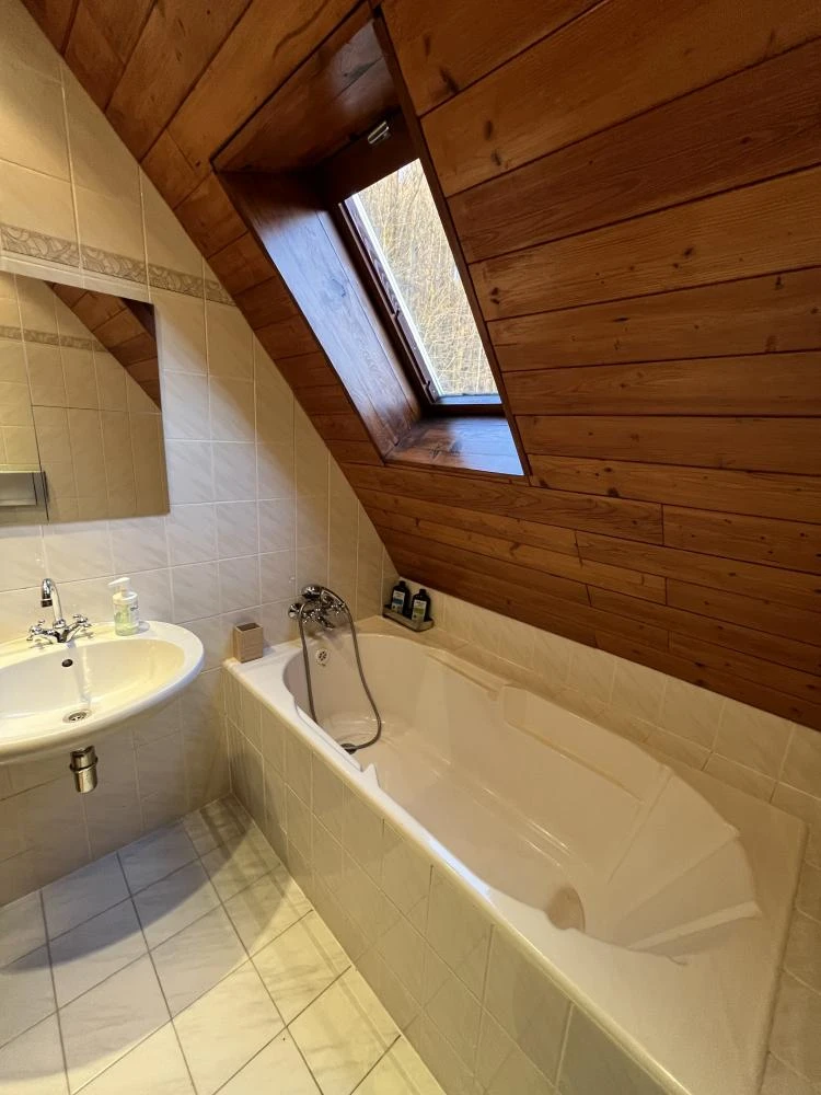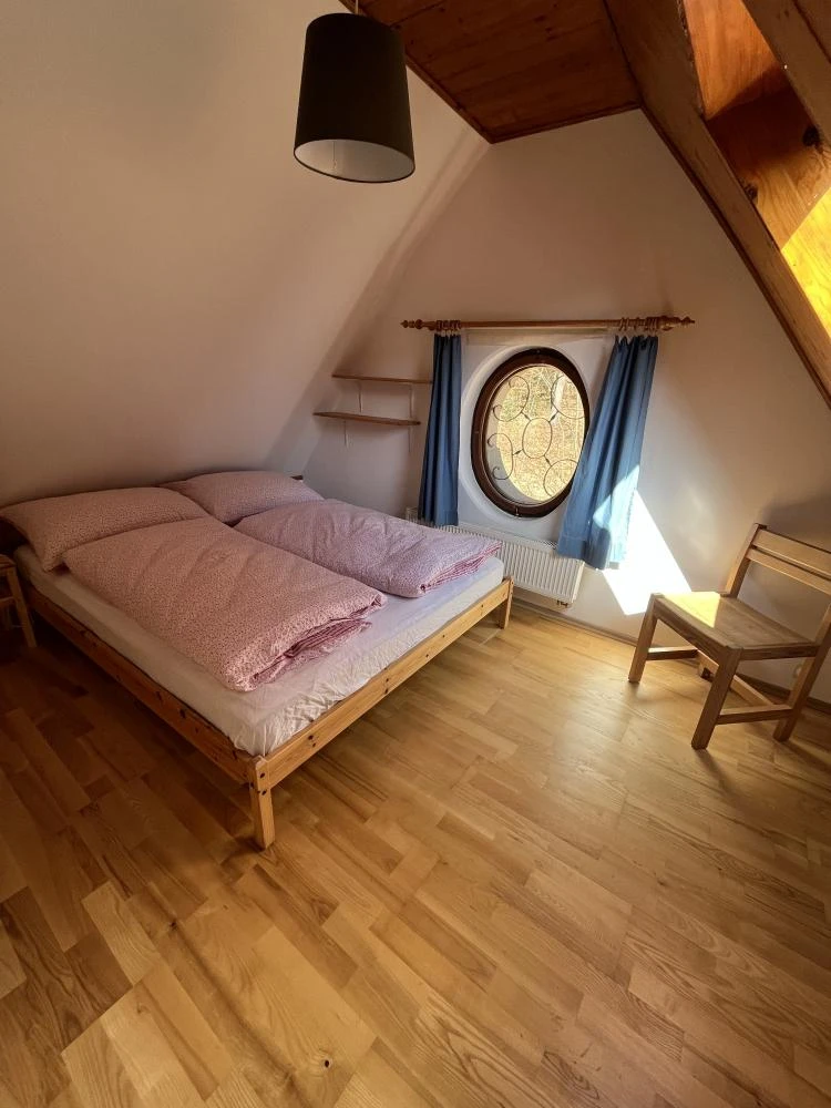 Šestilůžkový podkrovní pokoj s šatní skříní a vlastním posezením, pokoj tvoří tři samostatné ložnice. Velikost pokoje 40 m2, WC a koupelna s vanou (menší vana), fén. Wi-Fi zdarma, SMART TV, výhled do zahrady, do parku i do údolí na město.