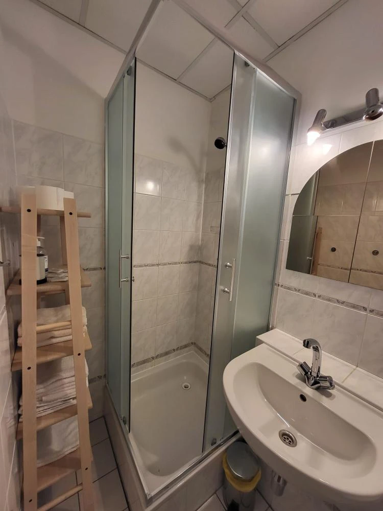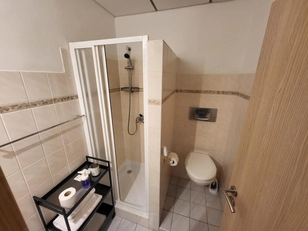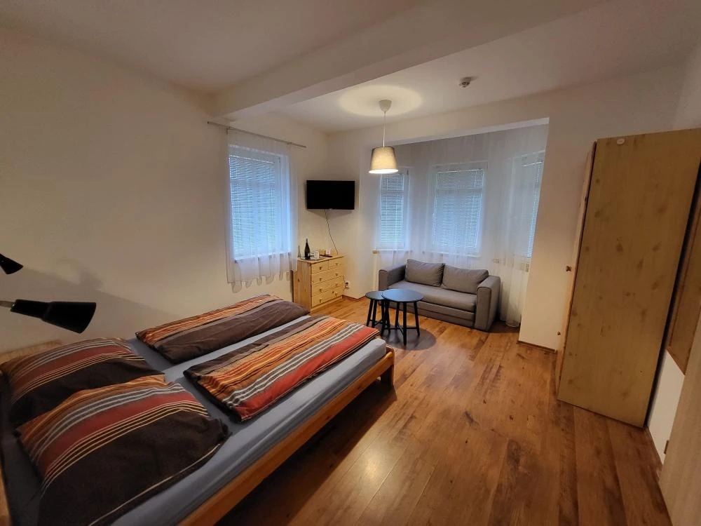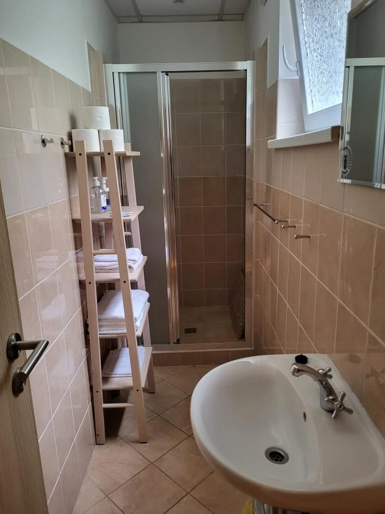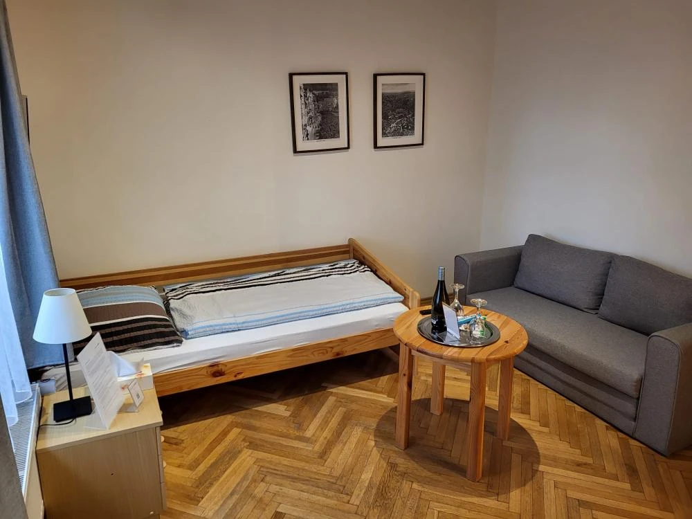 Třílůžkový pokoj s přistýlkou, šatní skříní a vlastním posezením s pohovkou. Velikost pokoje 20m2, WC a koupelna se sprchovým koutem, fén. Wi-Fi zdarma, SMART TV, výhled do zahrady a na město.