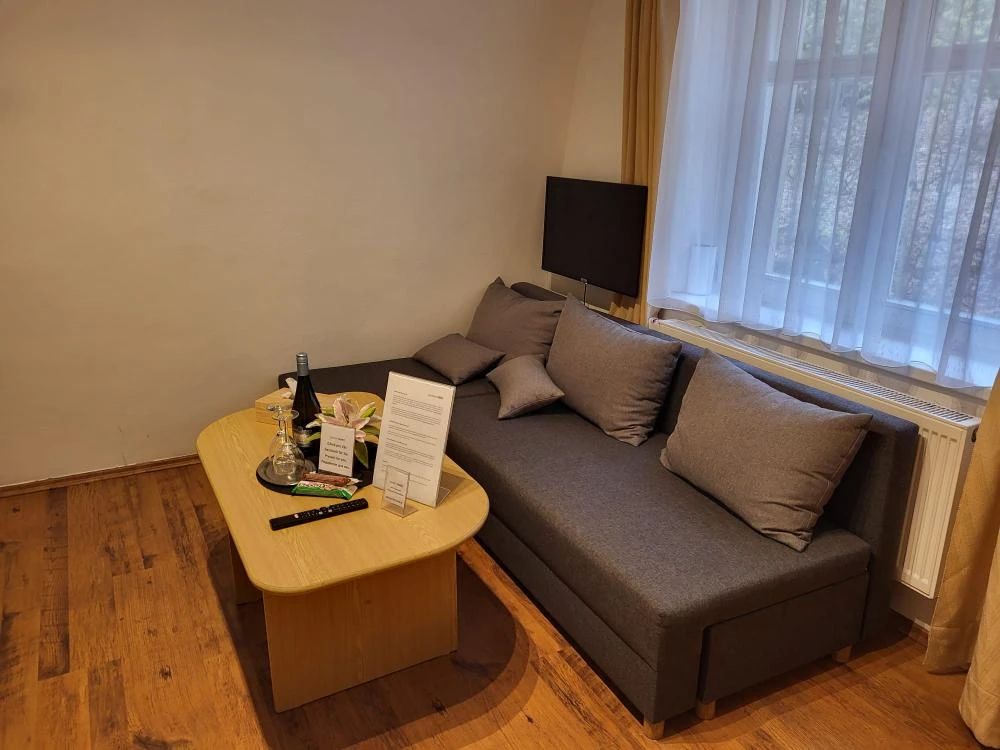 Třílůžkový pokoj se dvěma místnostmi, šatní skříní a vlastním posezením, . Velikost pokoje 25 m2, WC a koupelna se sprchovým koutem, fén. Wi-Fi zdarma, SMART TV, výhled od zahrady a do parku.