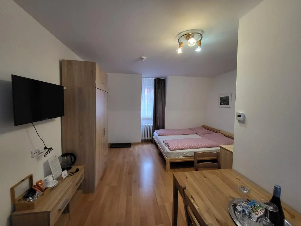 Dvoulůžkový apartmán s vlastním posezením, kávovarem, rychlovarnou konvicí, sporákem, lednicí a mikrovlnnou troubou. Velikost pokoje 25m2, Wi-Fi zdarma, SMART TV, výhled od zahrady, vlastní koupelna se sprchovým koutem.
