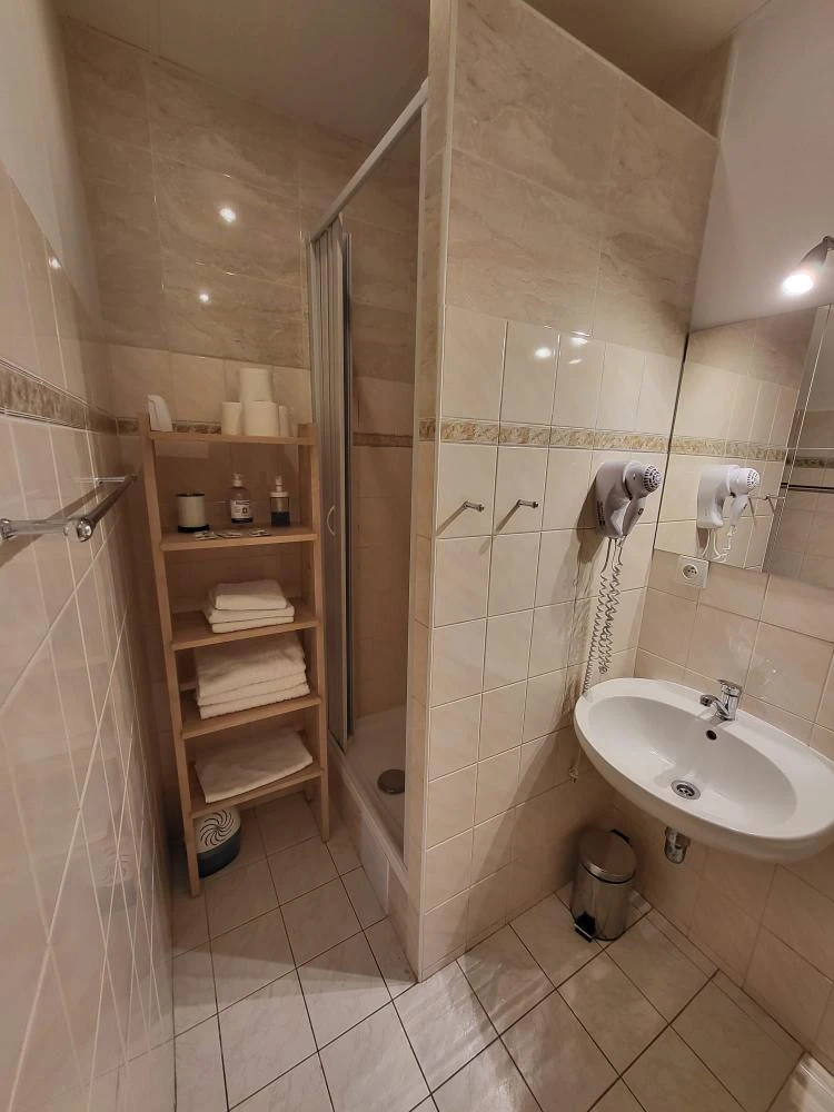 Třílůžkový pokoj s šatní skříní a vlastním posezením. Velikost pokoje 18m2, WC a koupelna se sprchovým koutem, fén. Wi-Fi zdarma, SMART TV, výhled do zahrady, do parku i do údolí na město.