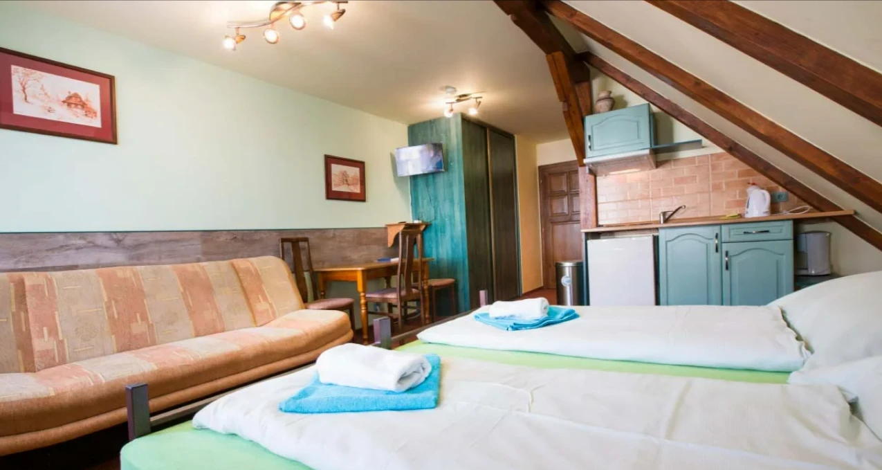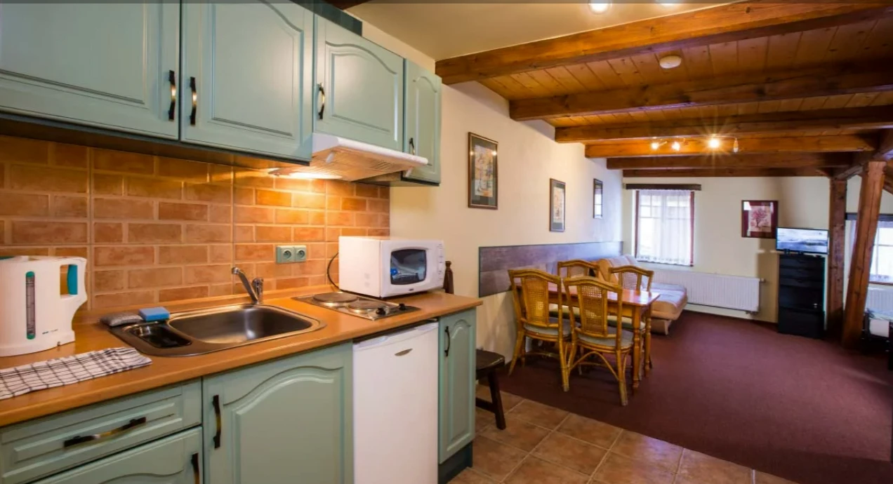 Apartmán č. 1 - 3 lůžka (3 jednolůžkové postele), kuchyňský kout (mikrovlnná trouba, lednička, varná deska, rychlovarná konvice, nádobí), LCD televize, WIFI, koupelna s vanou, WC a umyvadlem