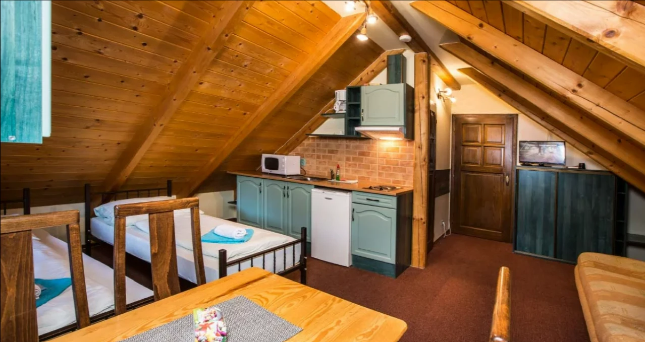 Apartmán č. 4 - 6 lůžek (5 jednolůžkových postelí + 1 rozkládací pohovka) kuchyňský kout (mikrovlnná trouba, lednička, trouba, varná deska, rychlovarná konvice, nádobí), LCD televize, WIFI, koupelna s vanou, WC a umyvadlem