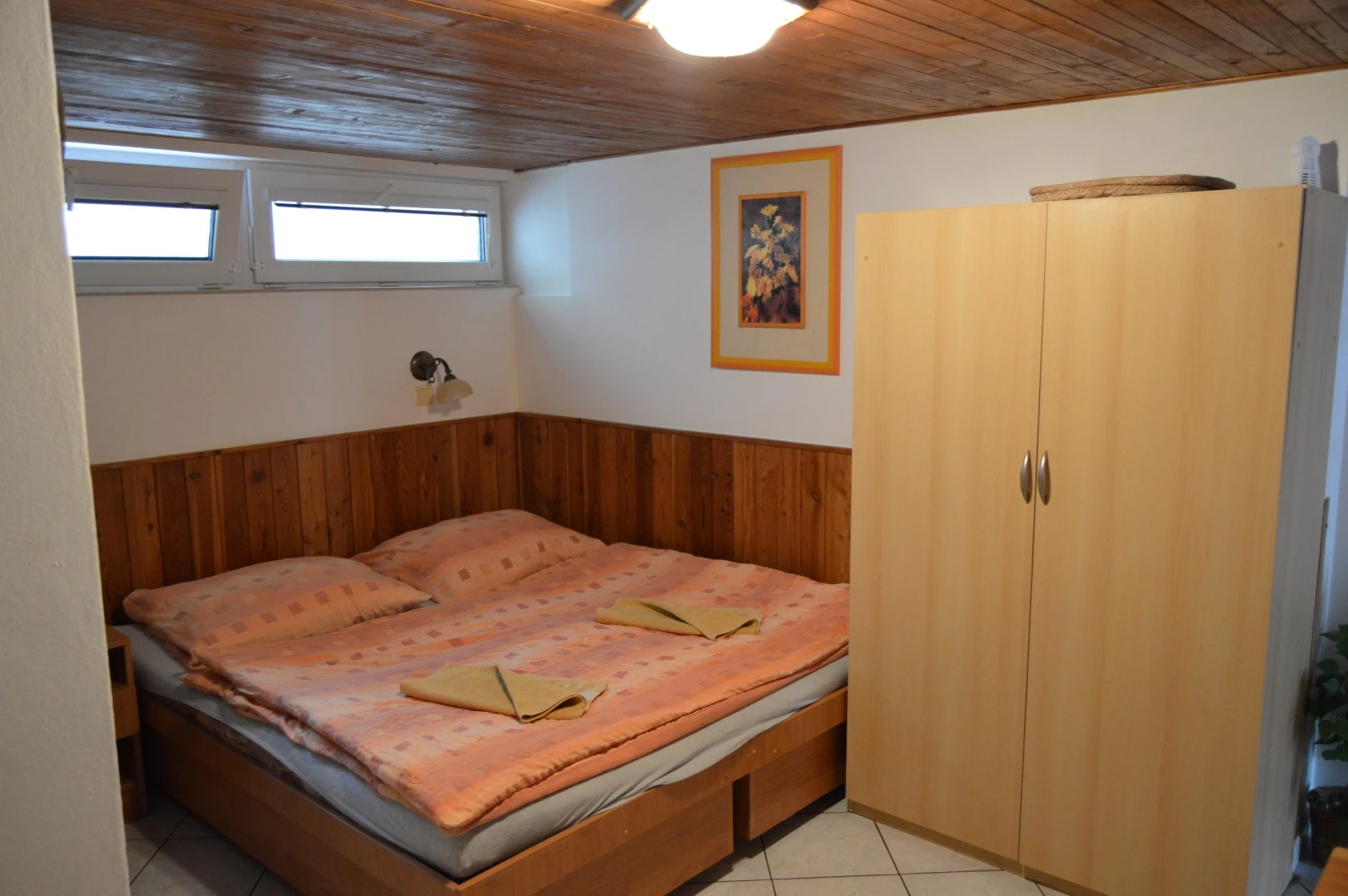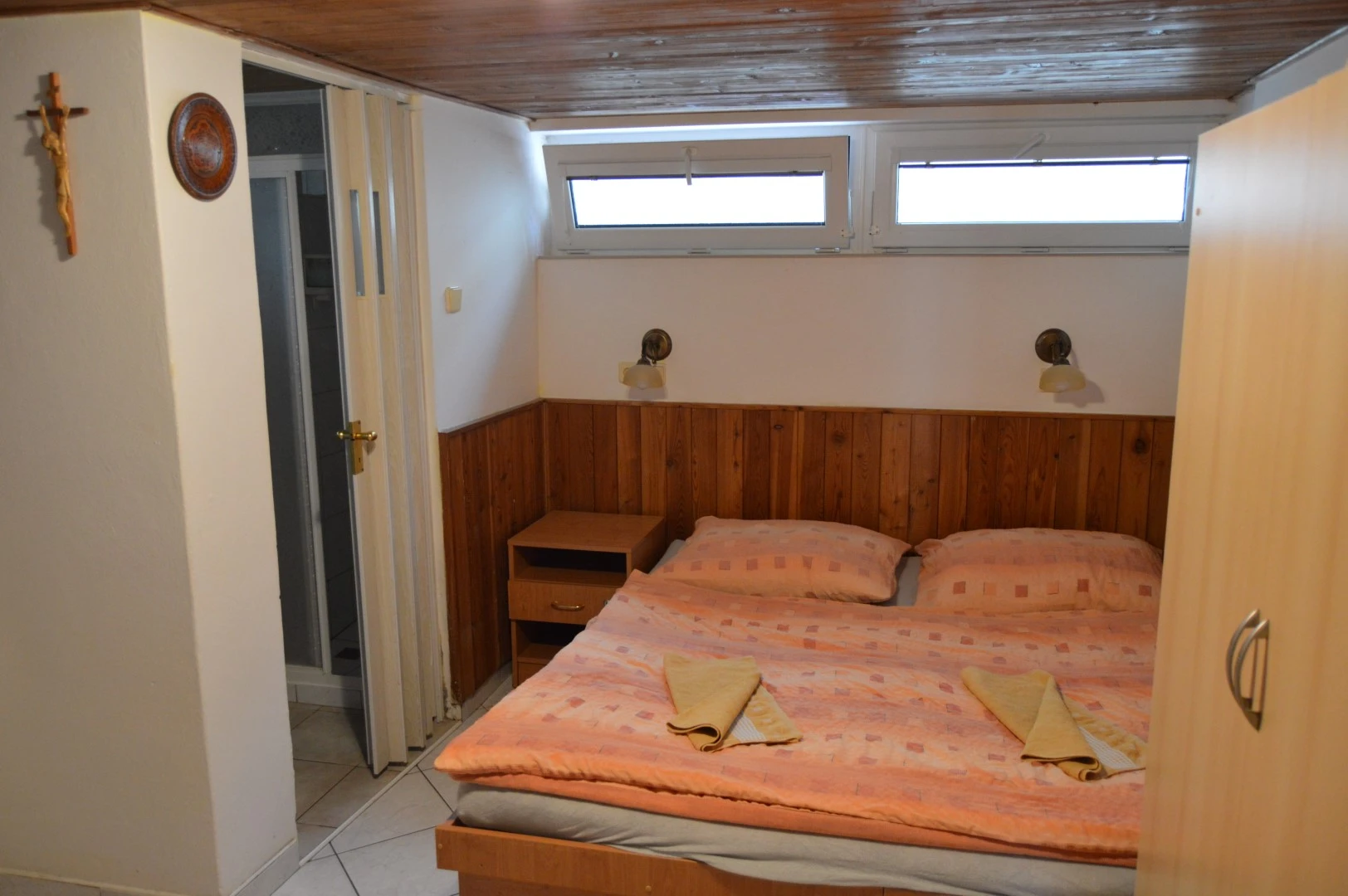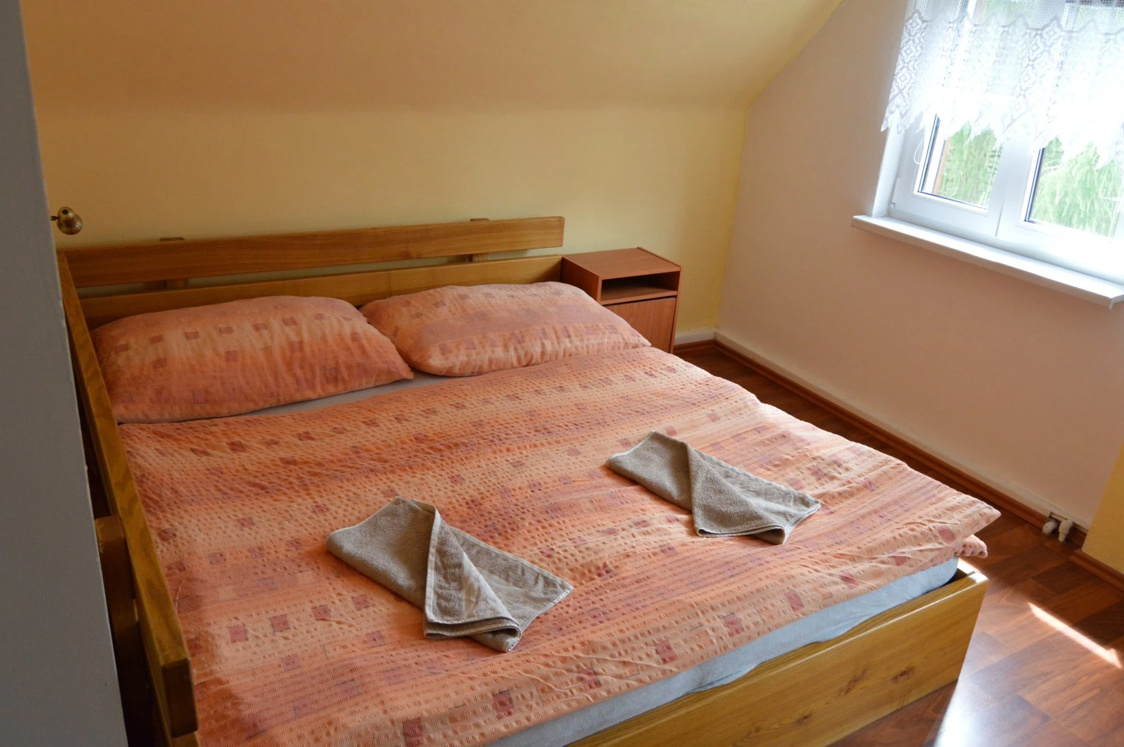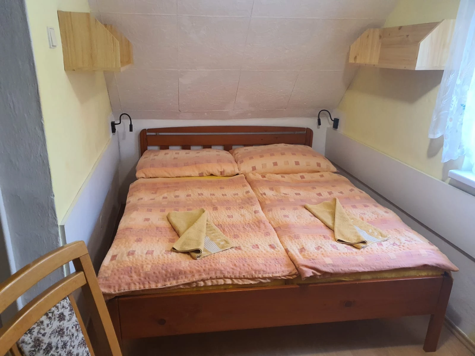- Pokoj č. 2 – menší pokojík pro 2 osoby, vhodný pro ty, kteří chtějí trávit čas venku. Má samostatnou koupelnu vedle pokoje a k dispozici je kuchyň o patro níže.