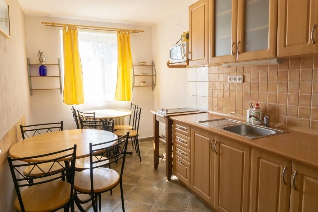 Apartmán má vlastní kuchyni s keramickou varnou desku, mikrovlnnou troubu, rychlovarnou konvici, lednici s mrazákem, kávovar a posezení a dvě samostatné koupelny se sprchovým koutem a toaletou.