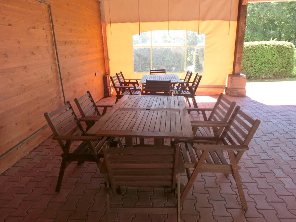Za nepříznivého počasí je k dispozici posezení pro všechny pod zastřešenou kůlnou (10m x 20m), kde jsou stoly, židle, pingpongový stůl... Je celá uzavíratelná plachtami proti dešti a hlavně větru. Zastřešená kůlna Vám poslouží jako místo na společné večerní posezení a pohodu.
