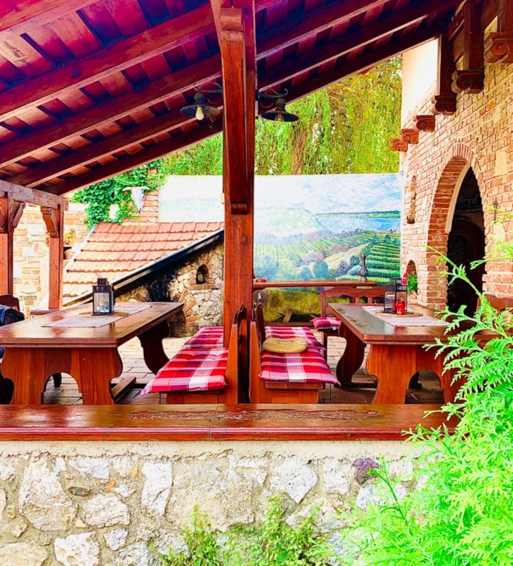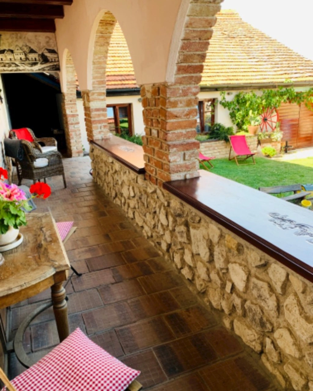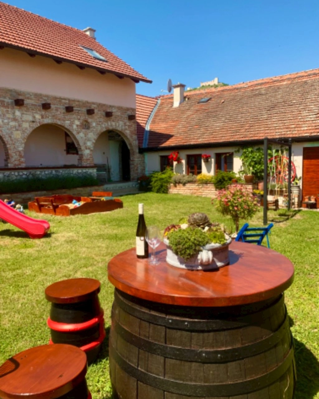 Penzion disponuje moderní, plně vybavenou kuchyní a jídelnou. Hosté mají k dispozici keramickou varnou desku, toustovač, lednici, rychlovarnou konvici a mikrovlnnou troubu, včetně potřebného nádobí a kuchyňských pomůcek. Venkovní prostor zahrnuje dvůr s pergolou a krbem, kde lze grilovat. Vína z místních vinařství jsou k dispozici.
