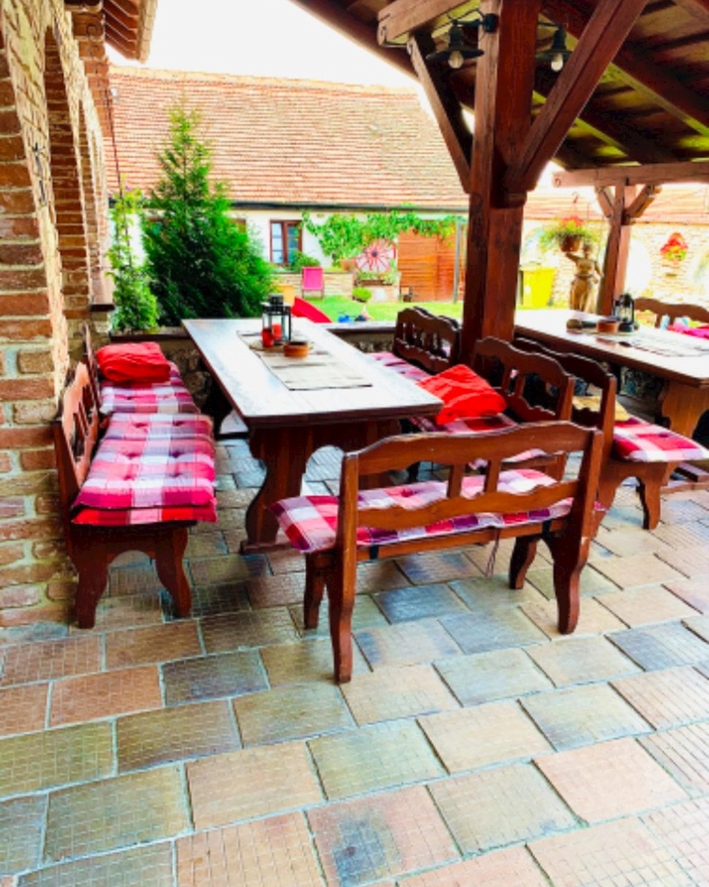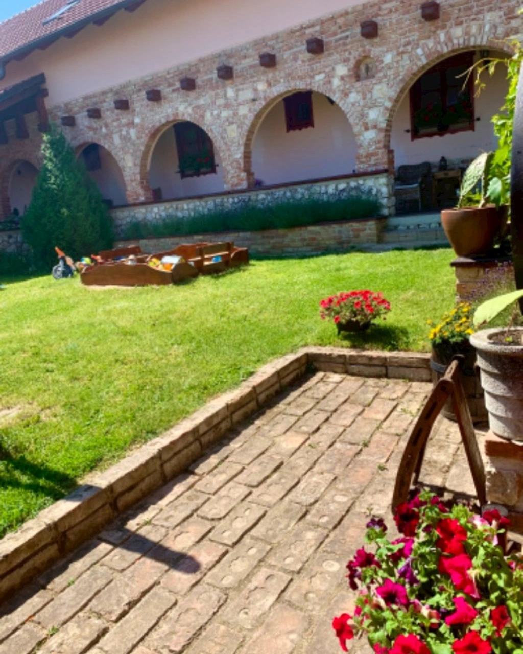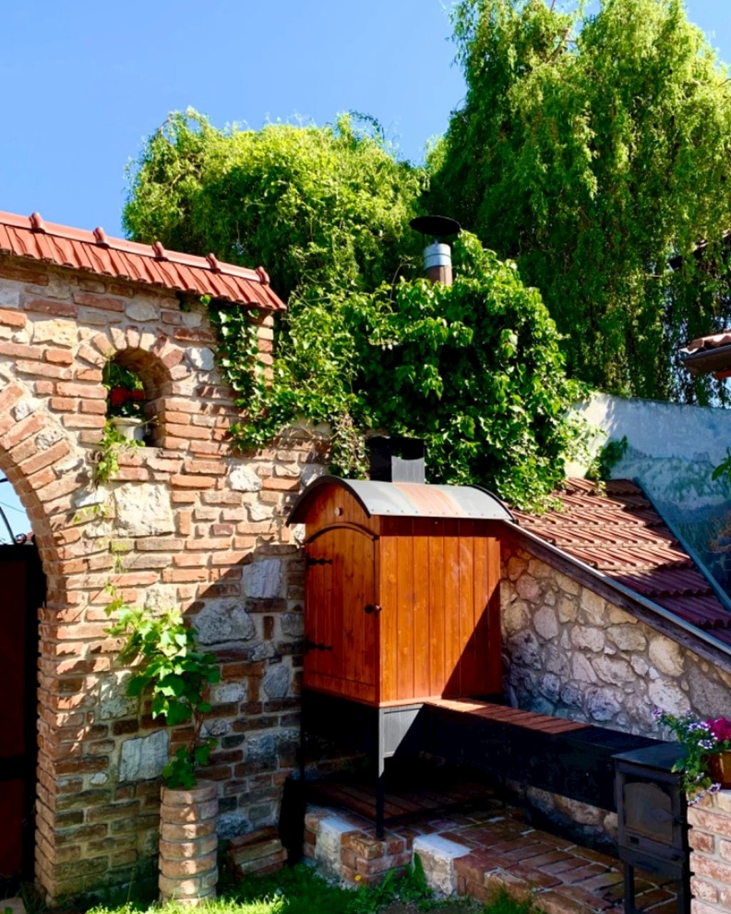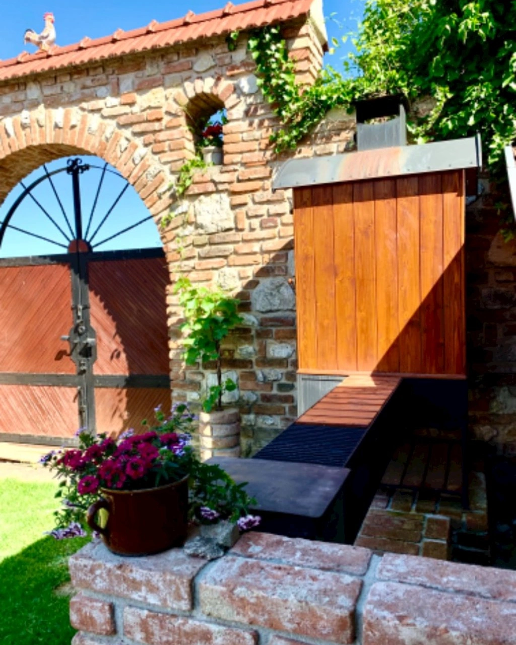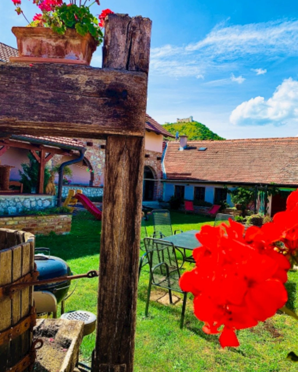 - Upravený dvůr s pergolou, krbem a grilem