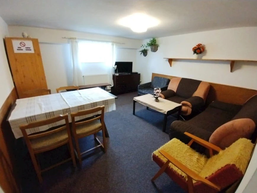 - Bezbariérový 5-lůžkový apartmán se dvěma ložnicemi (2-lůžková a 3-lůžková), obývacím prostorem, kuchyňským koutem a vlastní terasou.