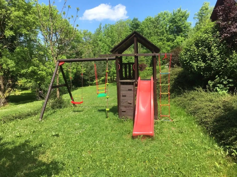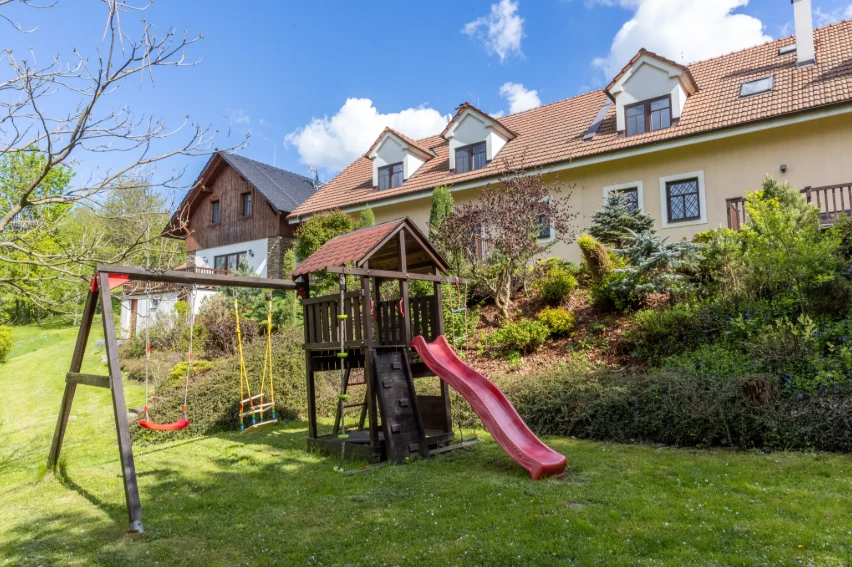 Dětské hřiště: houpačky, domek se skluzavkou, pískoviště