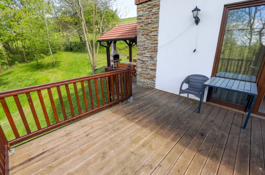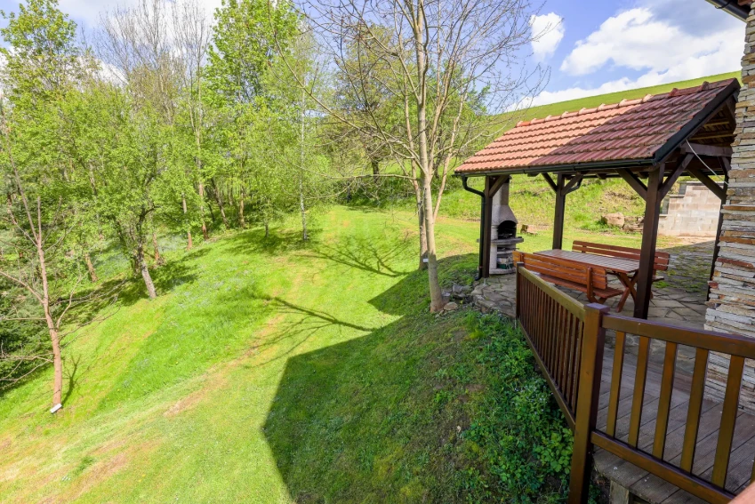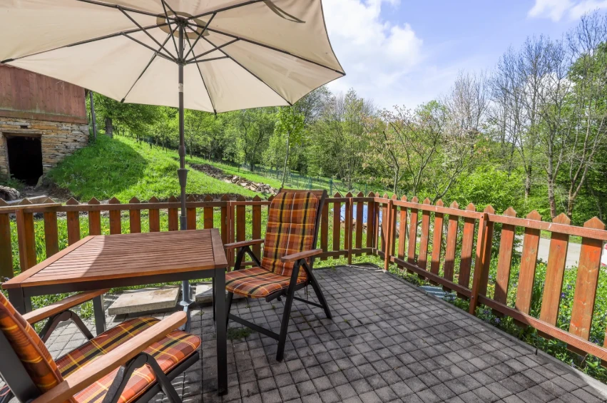 Apartmán 2: Kapacita 5 osob + dětská postýlka. Vybavení shodné s Apartmánem 1, včetně krbových kamen a terasy s vyhlídkou.