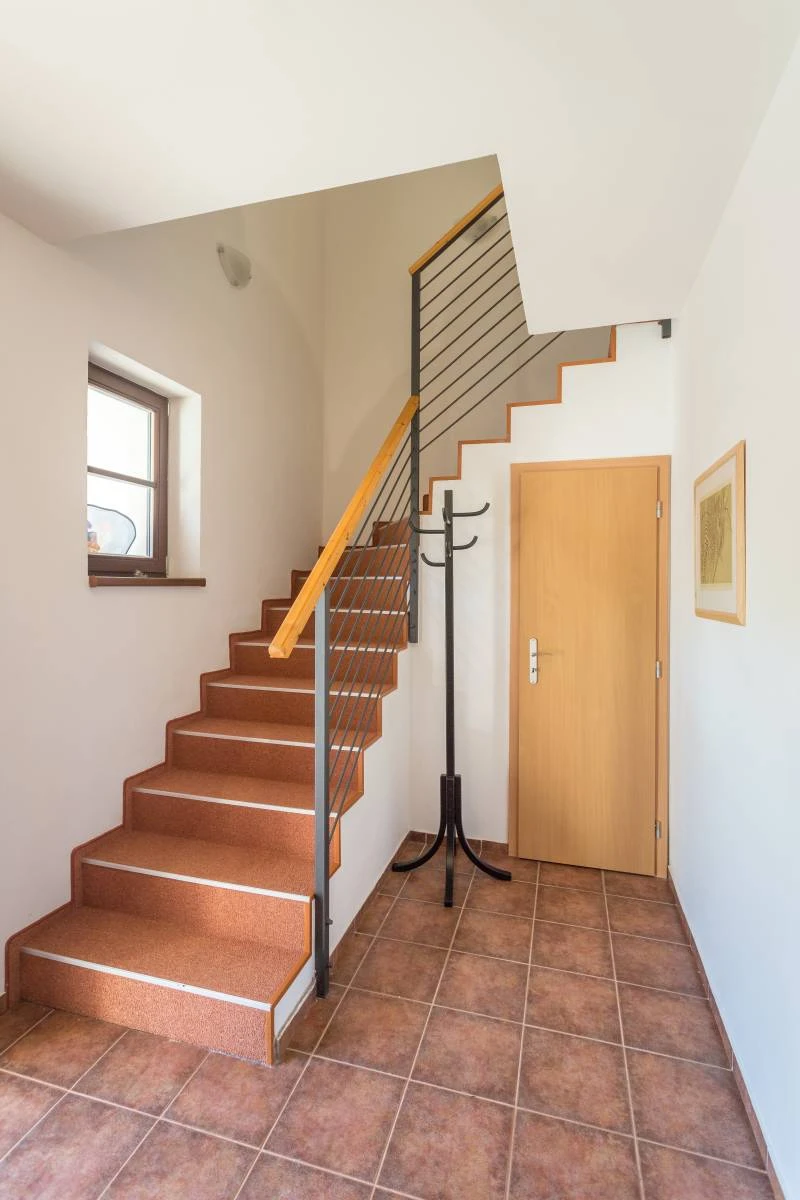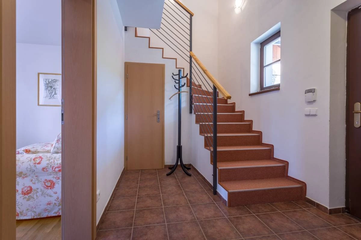 Kapacita a dispozice: Samostatný apartmán s kapacitou až pro 6 osob (plus možnost dětské postýlky). Dispozice: Přízemí: Obývací pokoj s rozkládacím gaučem. Kuchyňský kout. Koupelna se sprchovým koutem a WC. Patro: Ložnice s manželskou postelí a dvěma samostatnými lůžky. Přímý vstup na terasu a zahradu. Vybavení: Kuchyňský kout: Lednice. Mikrovlnná trouba. Sporák. Rychlovarná konvice. Obývací pokoj: TV. Krbová kamna. Wi-Fi internet. Další informace: Apartmán je nekuřácký. Možnost ubytování s domácím mazlíčkem za poplatek. Ceník: Cena za 2 osoby / noc: 1850 Kč (dle sezóny). Každá další osoba / noc: 750 Kč nebo 650 Kč (dle sezóny). Domácí zvíře / noc: 100 Kč. Dětská postýlka / noc: Zdarma. Sleva: Pobyt delší než 7 dní má nárok na slevu 5 %. Sleva platí i při obsazení celé kapacity apartmánu.