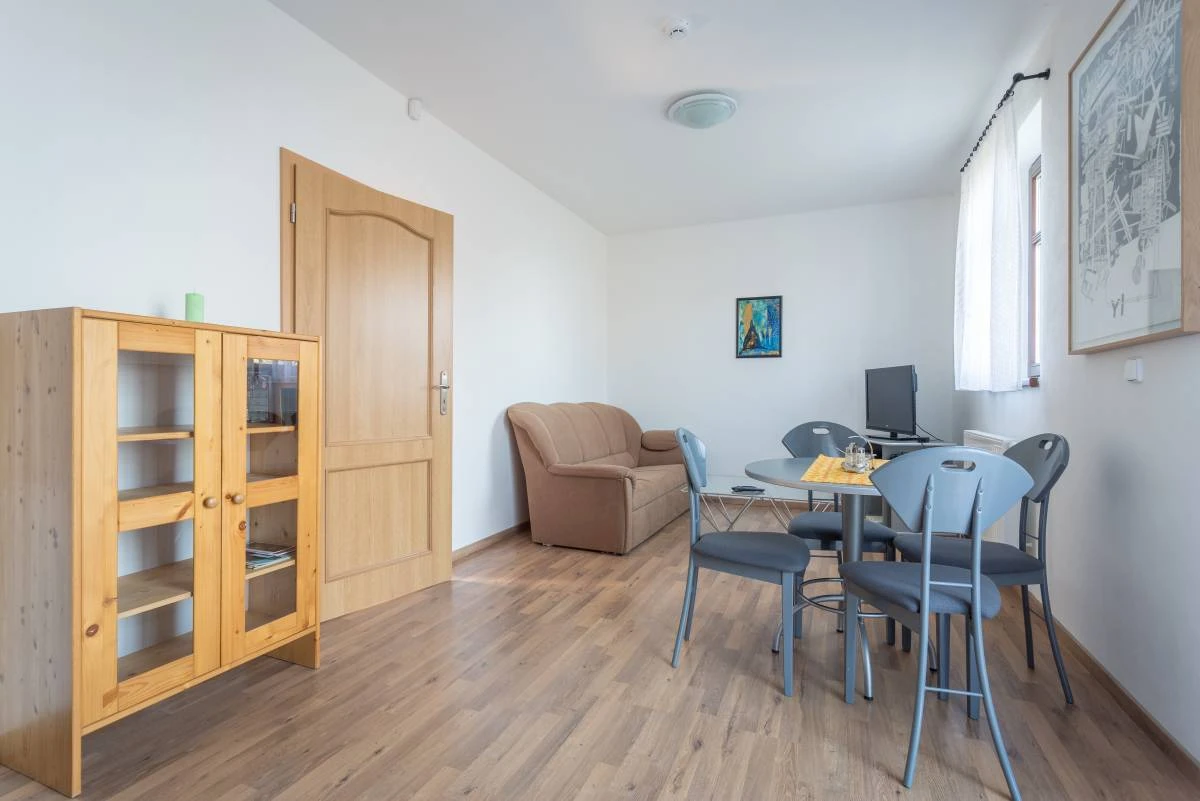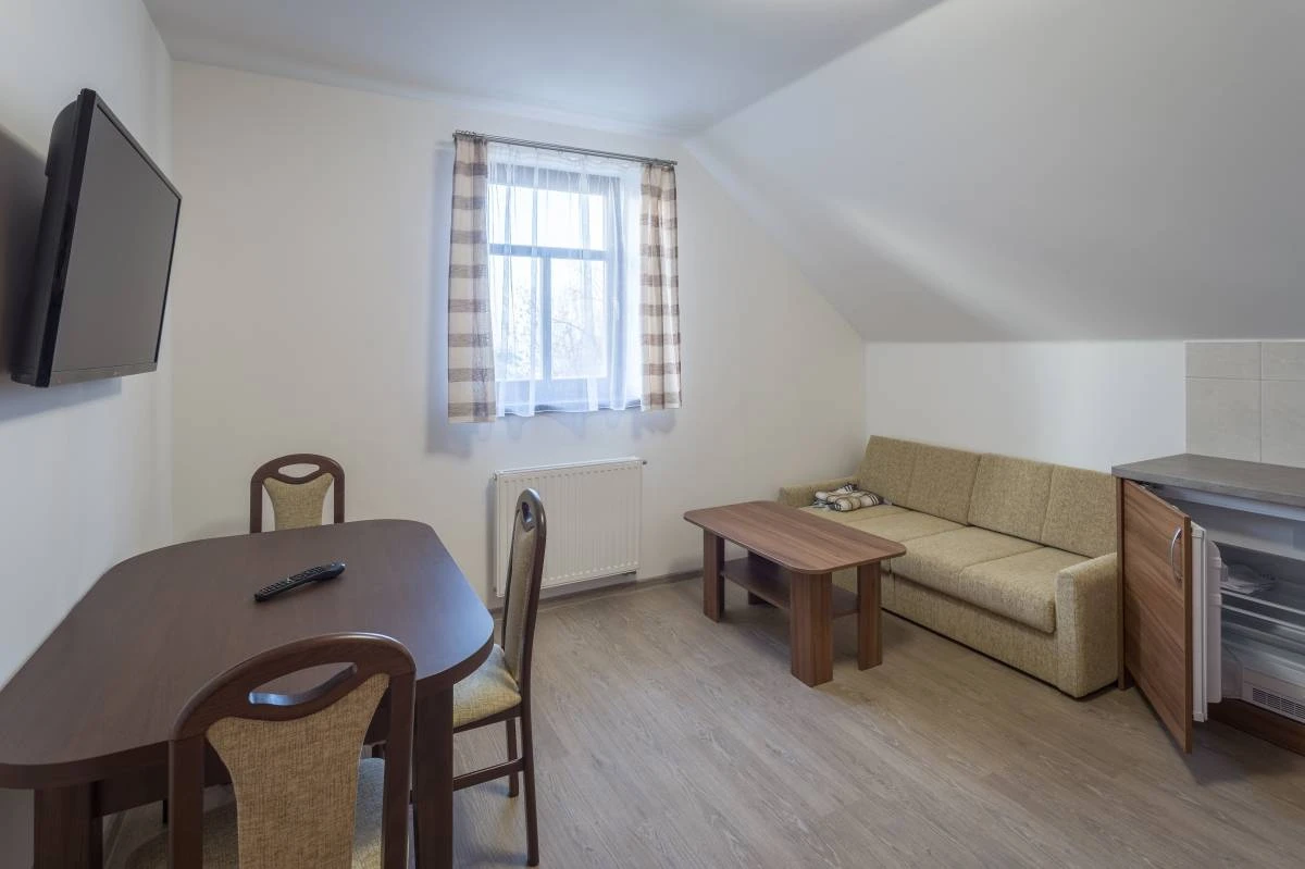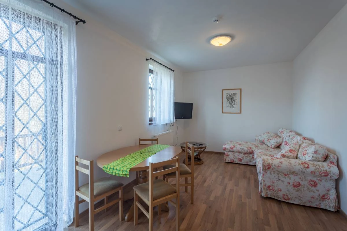 Kapacita a dispozice: Apartmán s kapacitou až pro 5 osob (plus možnost dětské postýlky). Dispozice: Ložnice s manželskou postelí. Obývací pokoj s rozkládacím gaučem a přistýlkou. Kuchyňský kout. Koupelna se sprchovým koutem a WC. Přímý vstup na terasu. Vybavení: Kuchyňský kout: Lednice. Mikrovlnná trouba. Sporák. Rychlovarná konvice. Obývací pokoj: TV. Wi-Fi internet. Další informace: Apartmán je nekuřácký. Možnost ubytování s domácím mazlíčkem za poplatek. Ceník: Cena za 2 osoby / noc: 1950 Kč nebo 1700 Kč (dle sezóny). Každá další osoba / noc: 750 Kč nebo 650 Kč (dle sezóny). Domácí zvíře / noc: 100 Kč. Dětská postýlka / noc: Zdarma. Sleva: Pobyt delší než 7 dní má nárok na slevu 5 %. Sleva platí i při obsazení celé kapacity apartmánu.