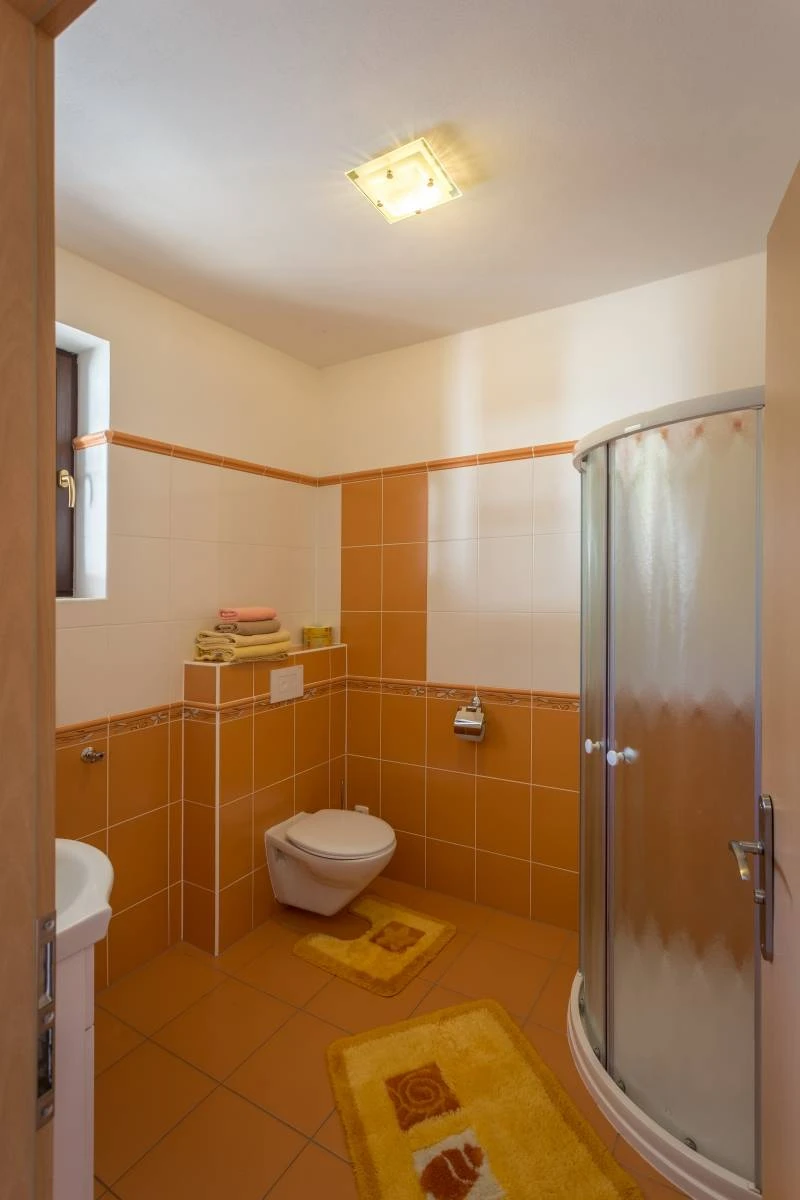 Kapacita a dispozice: Dvoupodlažní apartmán s kapacitou až pro 6 osob (plus možnost dětské postýlky). Přízemí: Chodba. Kuchyně spojená s obývacím pokojem. Koupelna s WC. Patro: Dvě ložnice: První ložnice s dvoulůžkem. Druhá ložnice s jednolůžkem a gaučem. V obývacím pokoji je rozkládací gauč. Přímý vstup na terasu z obývacího pokoje. Vybavení: Kuchyně: Lednice. Mikrovlnná trouba. Sporák. Rychlovarná konvice. Obývací pokoj: TV. Krbová kamna. Wi-Fi internet. Další informace: Apartmán je nekuřácký. Možnost ubytování s domácím mazlíčkem za poplatek. Ceník: Cena za 2 osoby / noc: 1950 Kč nebo 1700 Kč (dle sezóny). Každá další osoba / noc: 750 Kč nebo 650 Kč (dle sezóny). Domácí zvíře / noc: 100 Kč. Dětská postýlka / noc: Zdarma. Sleva: Pobyt delší než 7 dní má nárok na slevu 5 %. Sleva platí i při obsazení celé kapacity apartmánu.
