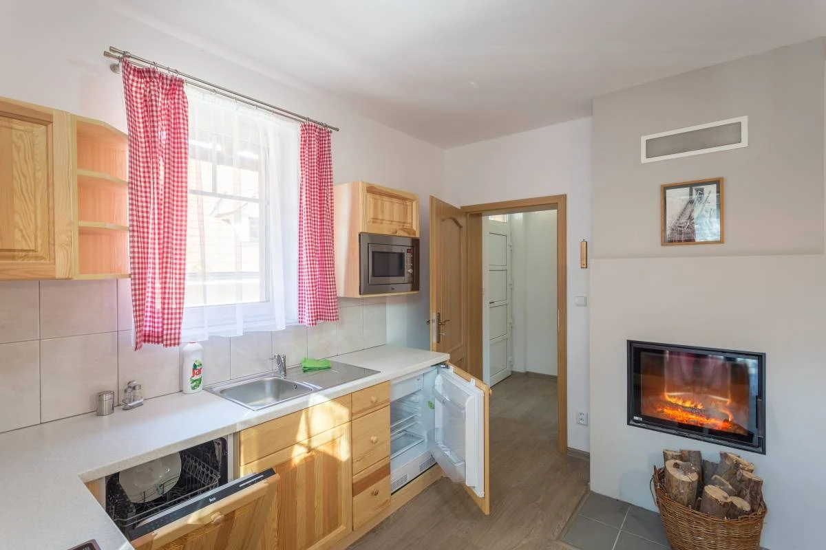 Apartmán Domeček: Kapacita 2 osoby. Vybavení zahrnuje lednici, mikrovlnnou troubu, sporák, rychlovarnou konvici, TV, krb, Wi-Fi internet a terasu.