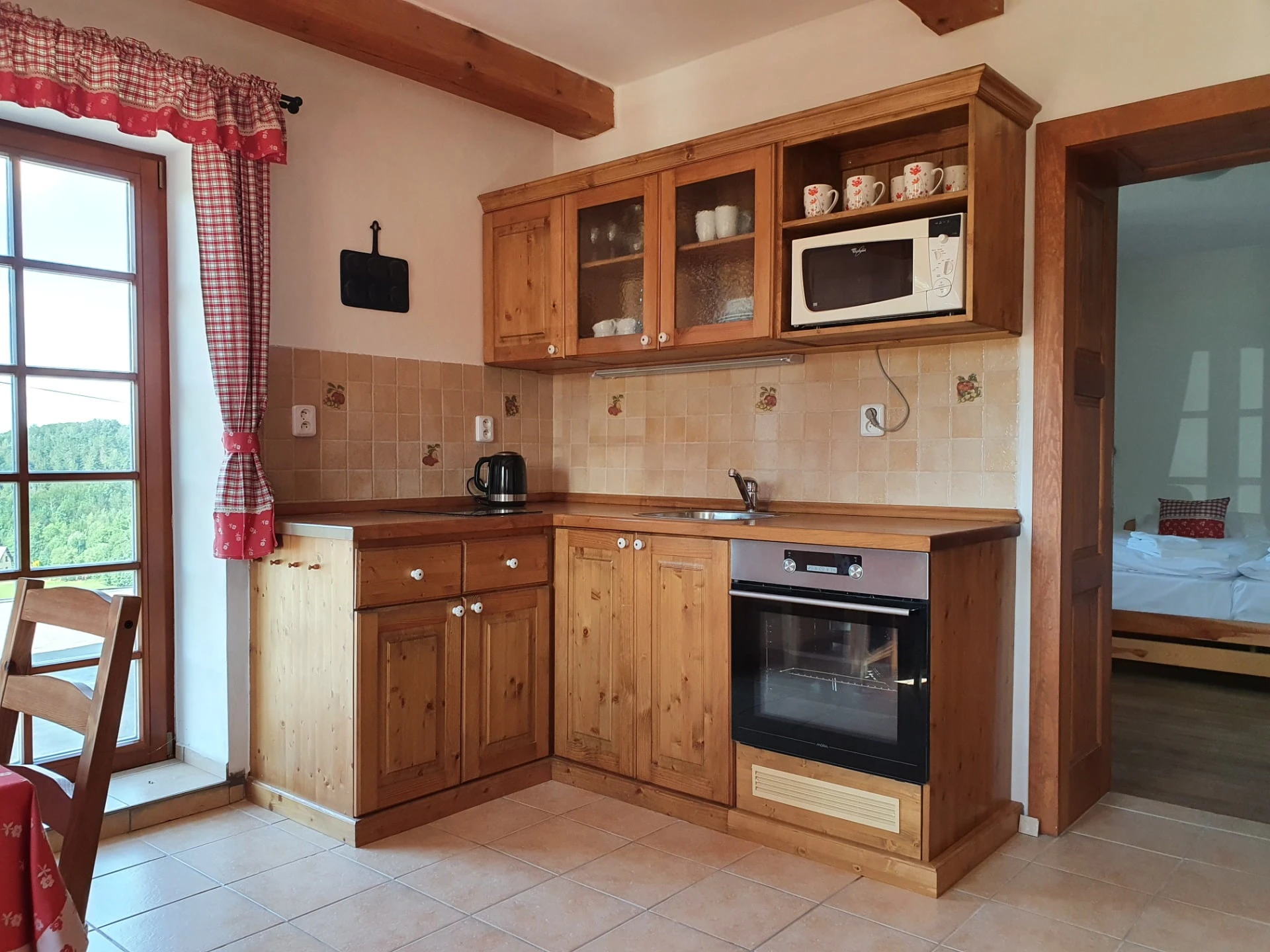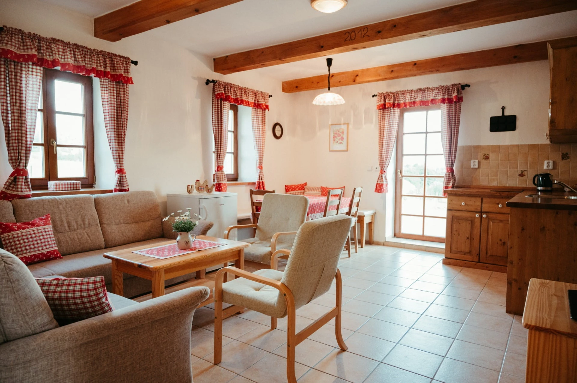 Apartmán č. 1 Červený pro 4 osoby + 1 přistýlka - skládá se ze dvou ložnic a obývacího pokoje s kuchyní a jídelnou, koupelnou s WC.