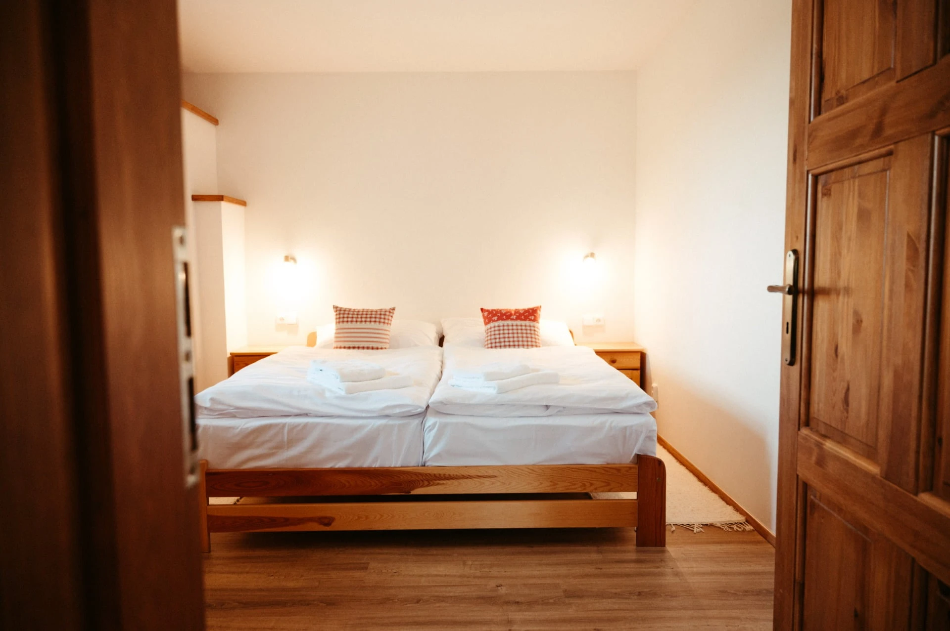 Ubytovat se můžete v apartmánech pro 2 – 5 osob s možností přistýlky a dvoulůžkových pokojích. Ubytování pro děti do 3 let bez nároku na lůžko je zdarma. Apartmány a pokoje jsou vybaveny nábytkem z masivu, postele mají kvalitní vysoké matrace.