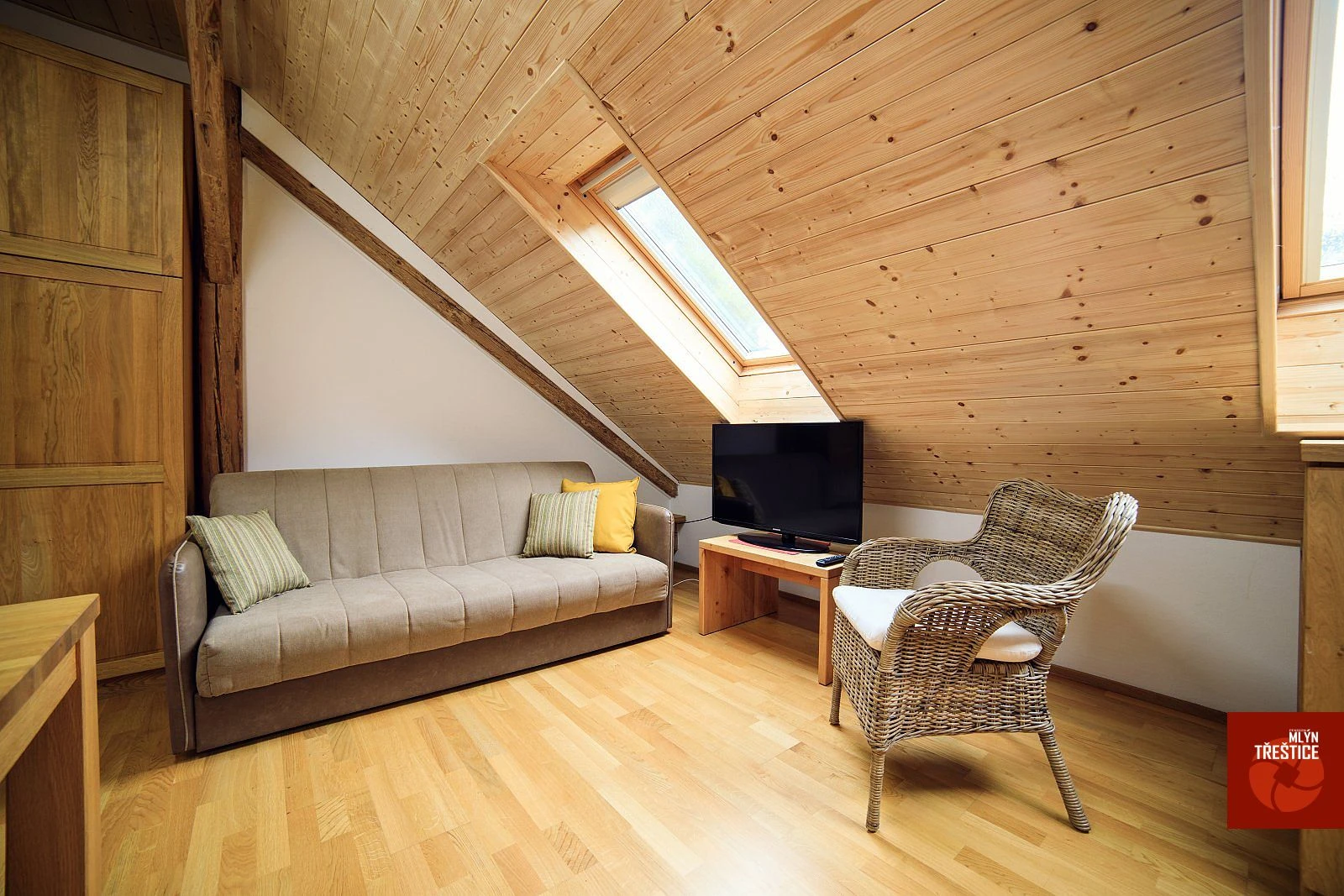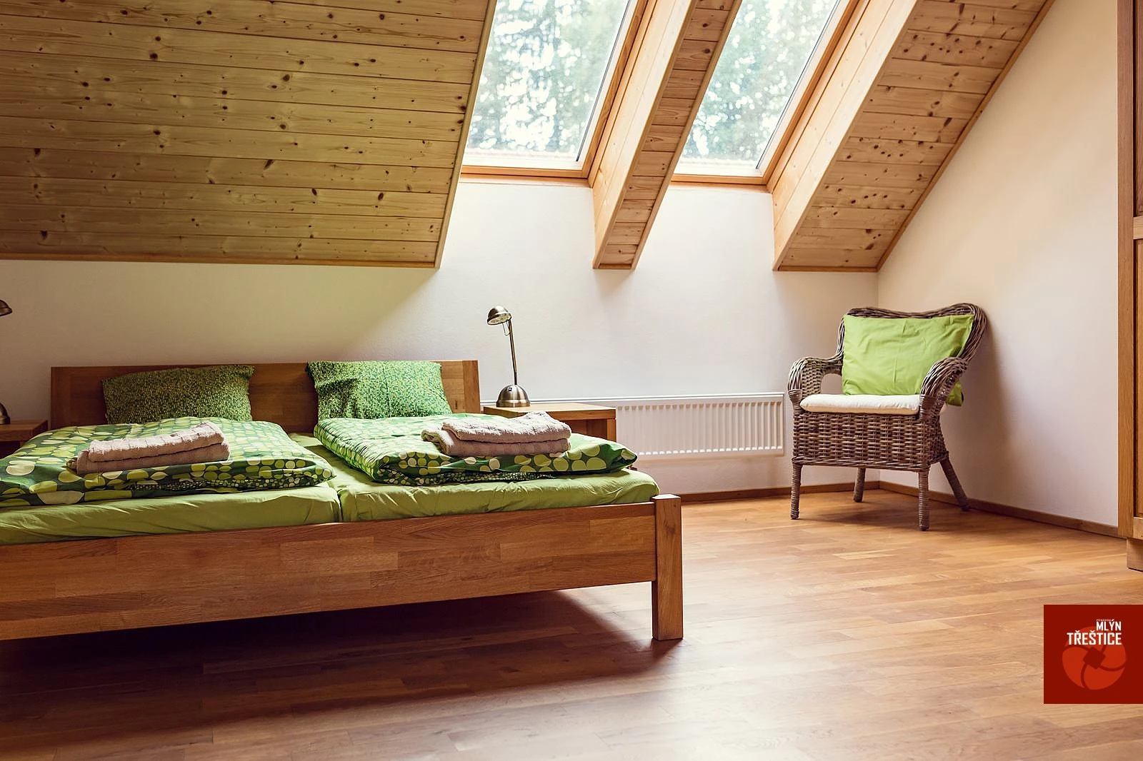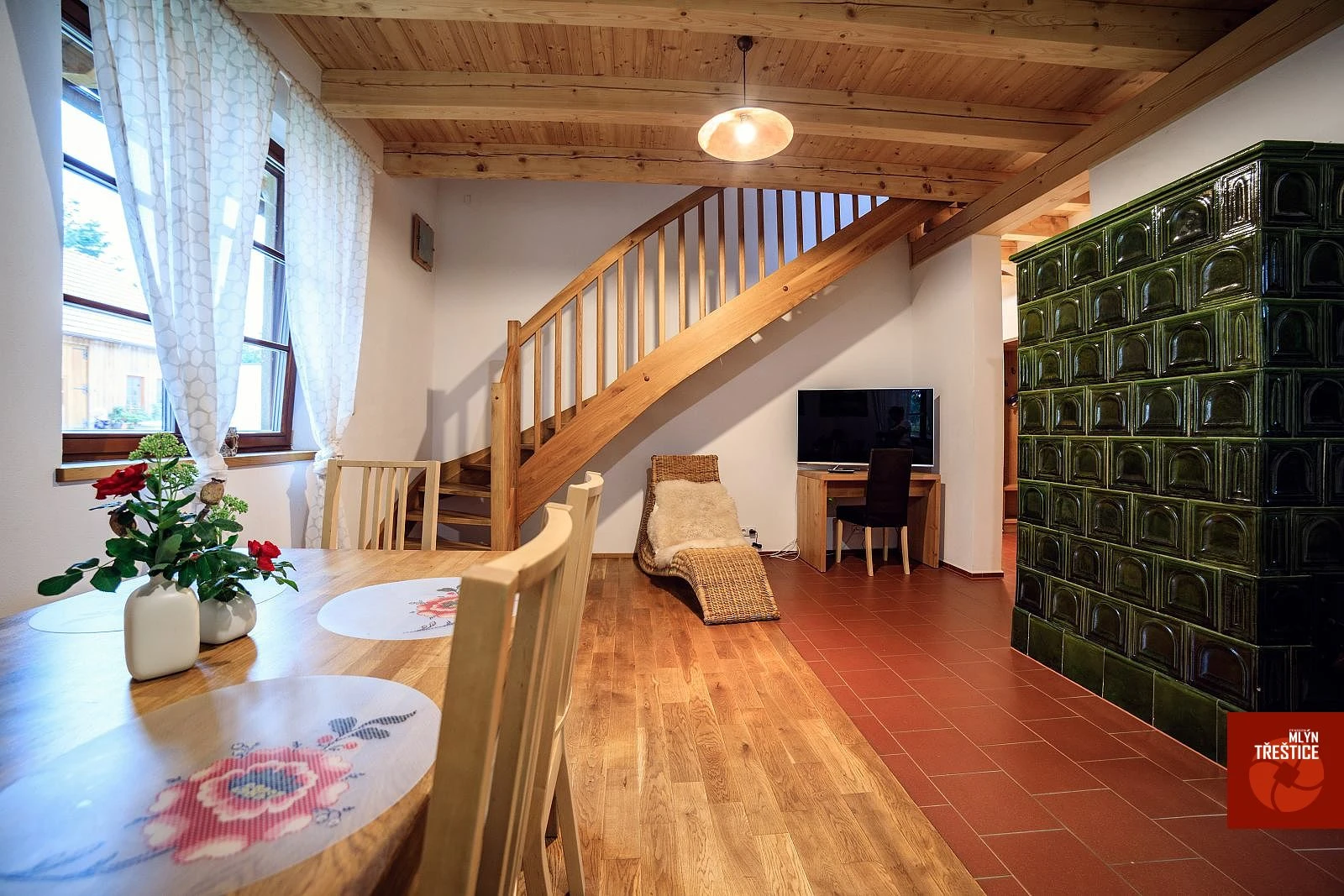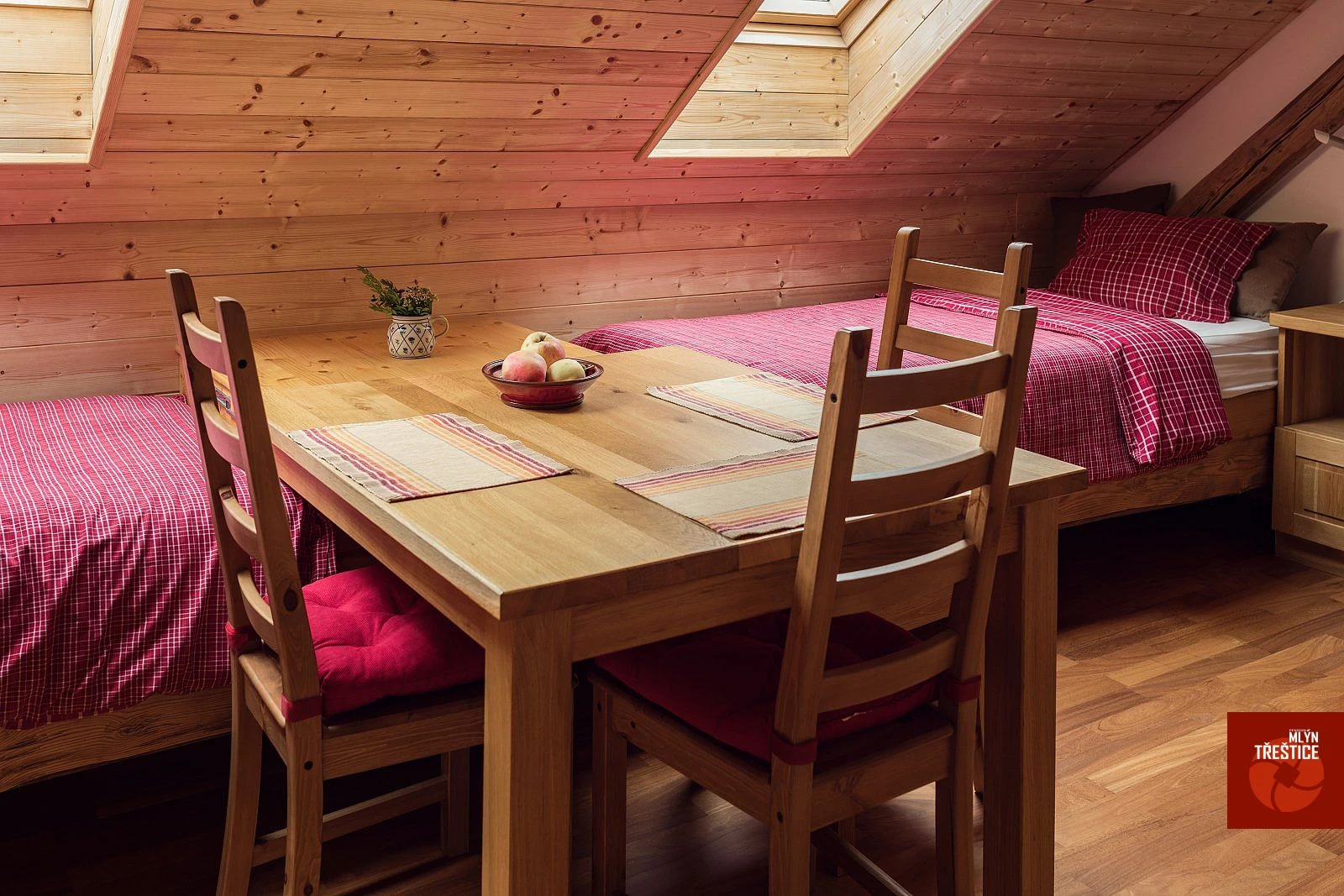 - Apartmány vybavené z přírodních materiálů (dubové a smrkové dřevo, keramická dlažba).