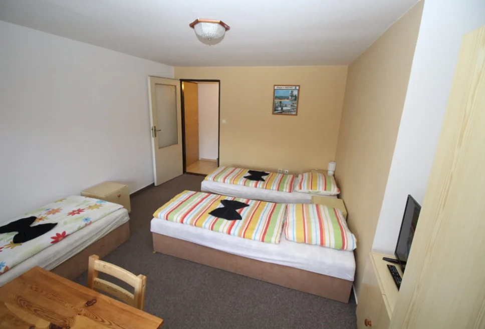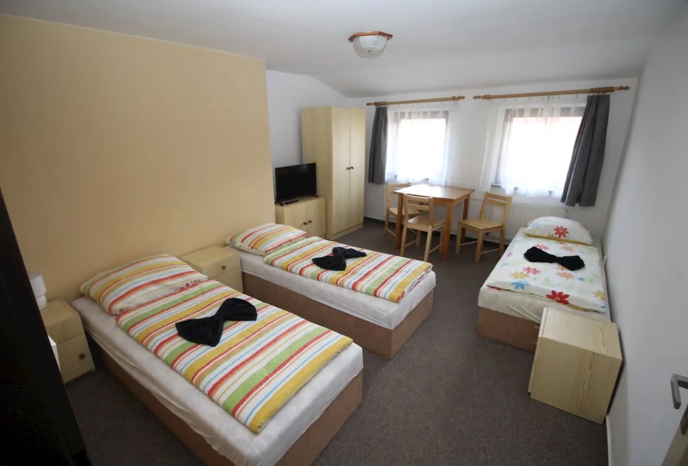 - Třílůžkové pokoje (č. 8, 11): 1 500 Kč/pokoj/noc (min. 1 osoba, 1 noc)