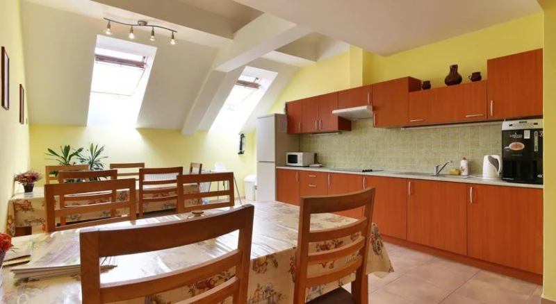 - Společná kuchyně - velká lednice, kuchyňská linka včetně nádobí, sklokeramická varná deska, mikrovlnka, rychlovarná konvice, jídelní stoly, mycí prostředky.