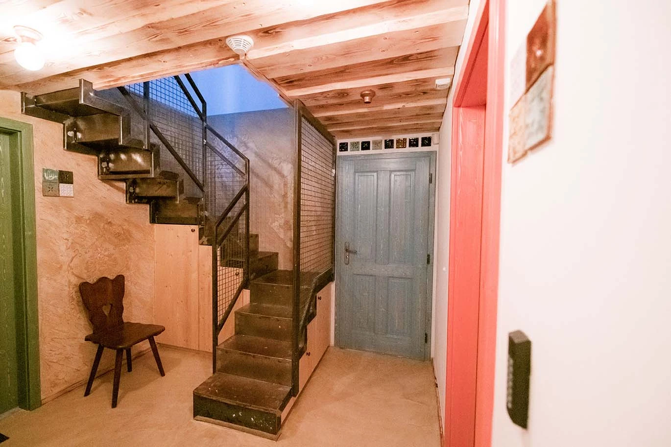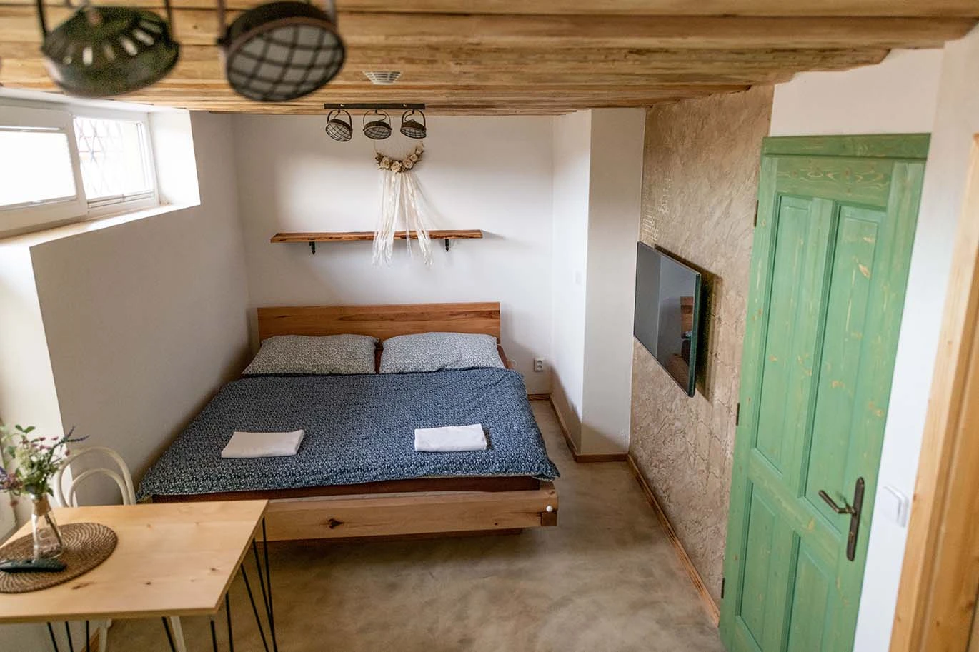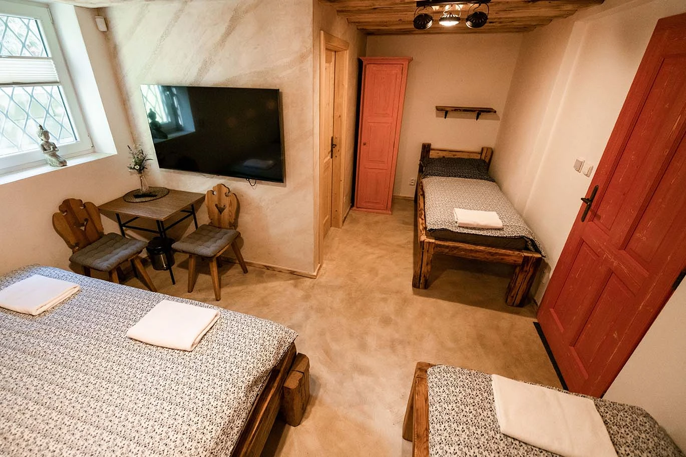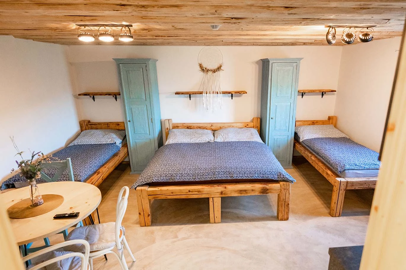 Každý pokoj má svou specifickou barvu, ručně drásané masivní dveře a je pojmenován podle vnoučat rodiny Hanušových.