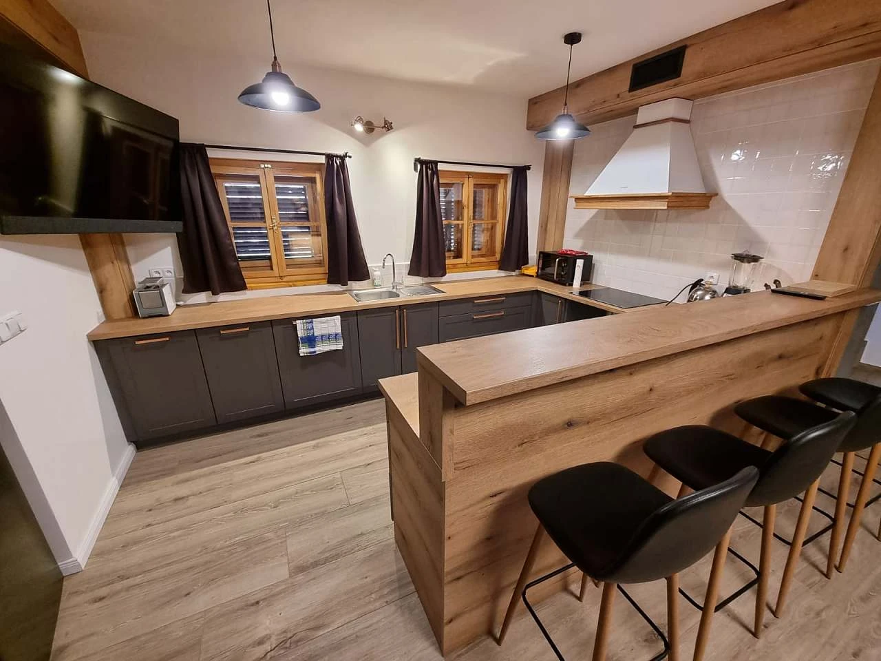 Kuchyň je plně vybavena a zahrnuje horkovzdušnou troubu, sklokeramickou desku, myčku, mikrovlnnou troubu, varnou konvici, kávovar, toastovač, sendvičovač, mixér, fritézu, lednici s mrazákem, pekárnu na chleba a samostatnou spíž. V obývací části jsou jídelní stoly, pohodlná sedačka a TV s kabelovou televizí a DVD přehrávačem.