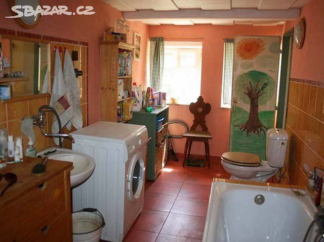 1 koupelna - vana, WC. Koupelna má ohřev vody el. bojlerem, vanu, toaletu, umyvadlo, komodu s ručníky a osuškami.