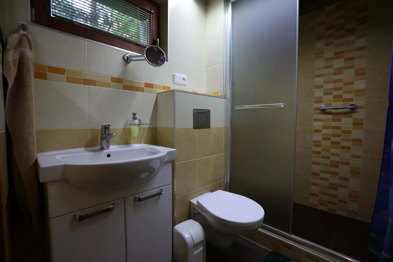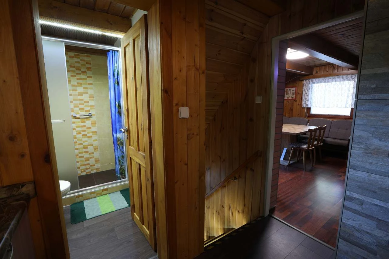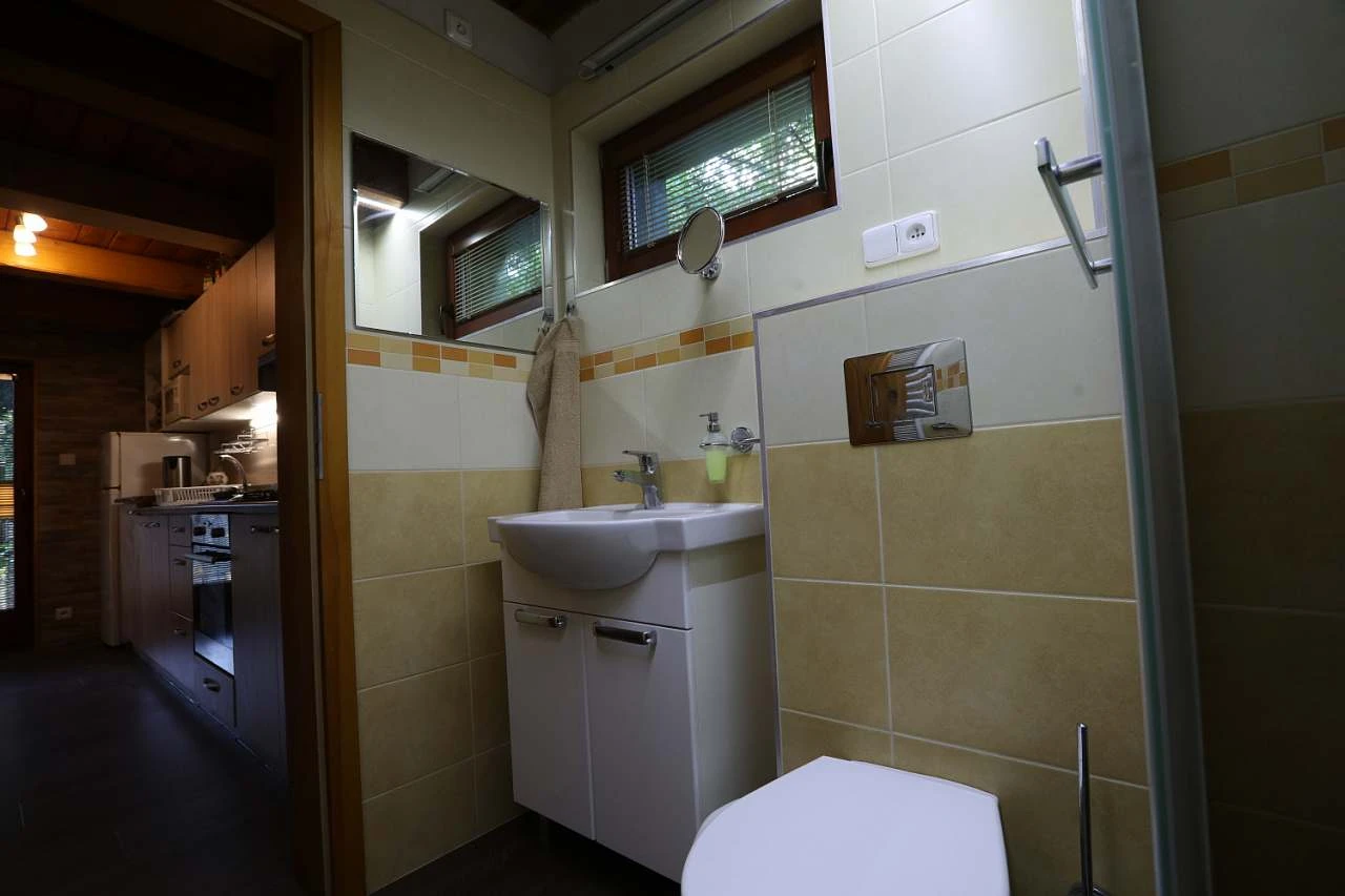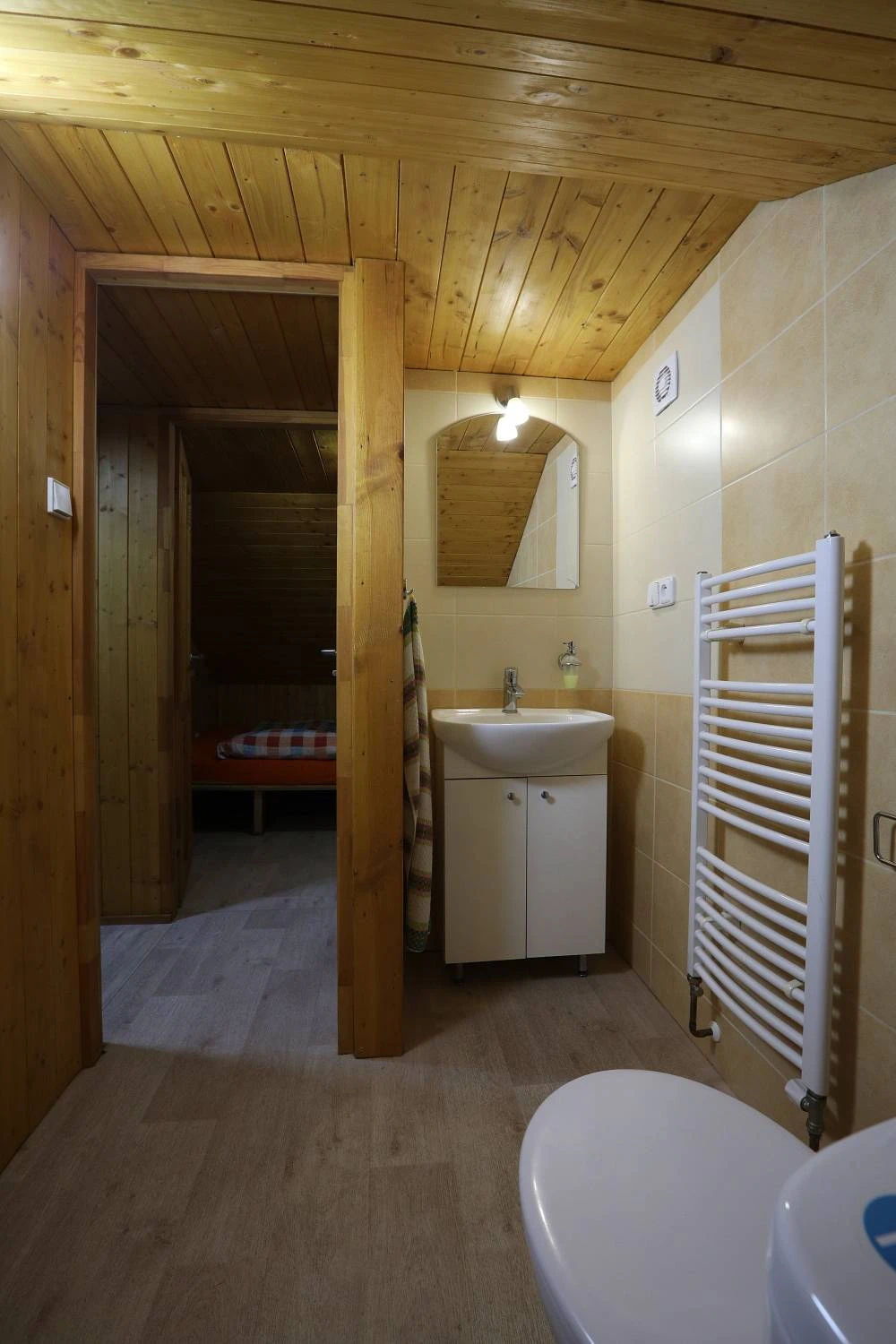 V chatě je vytápěná koupelna se sprchou, umyvadlem a WC + dvě další samostatné WC