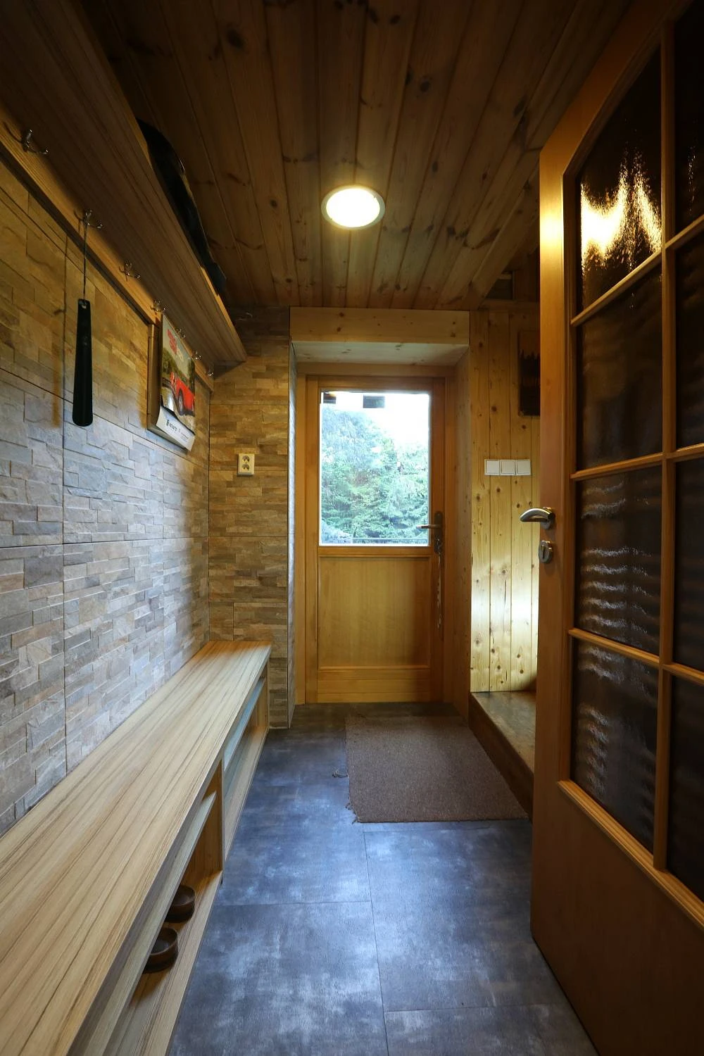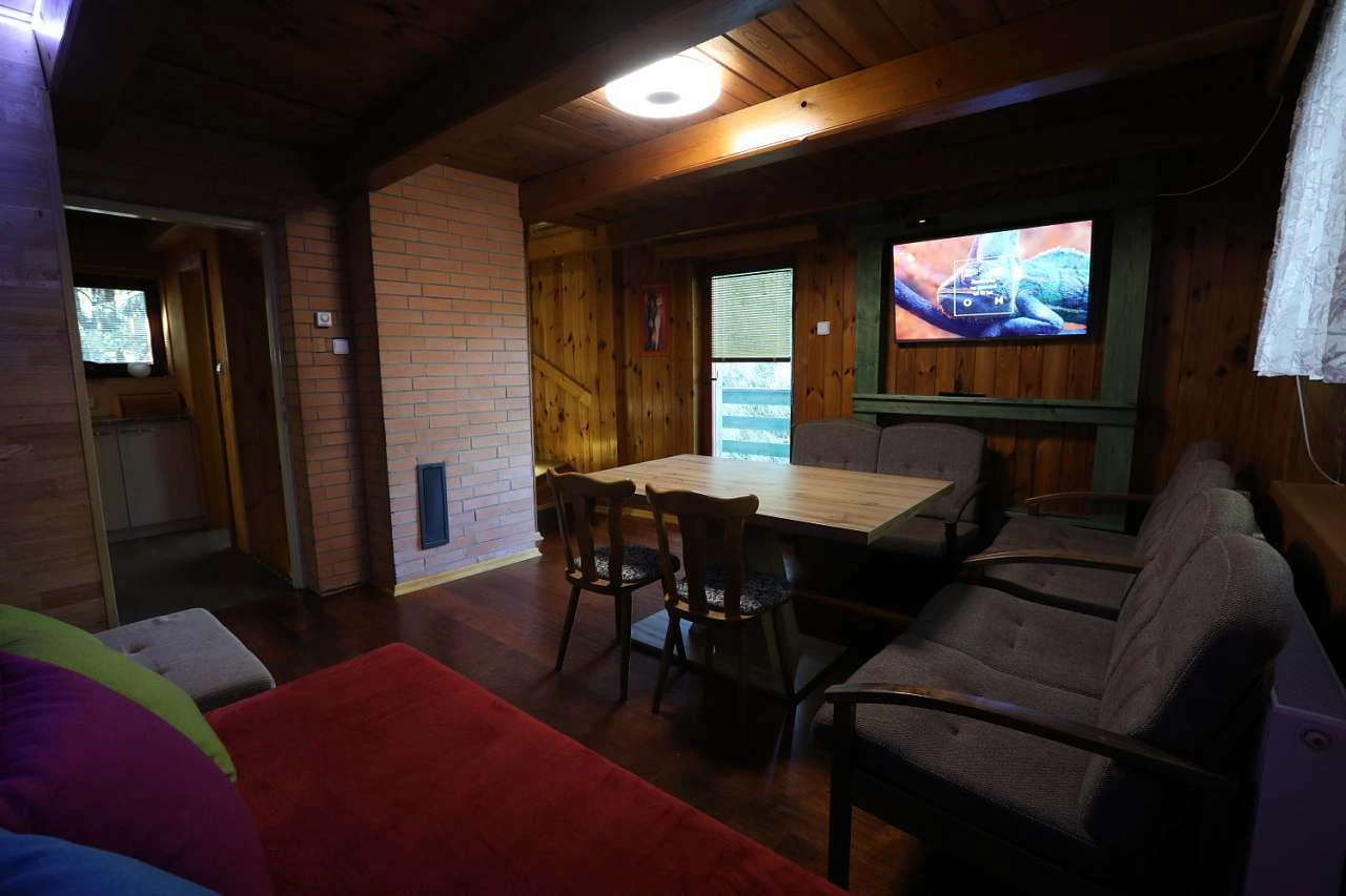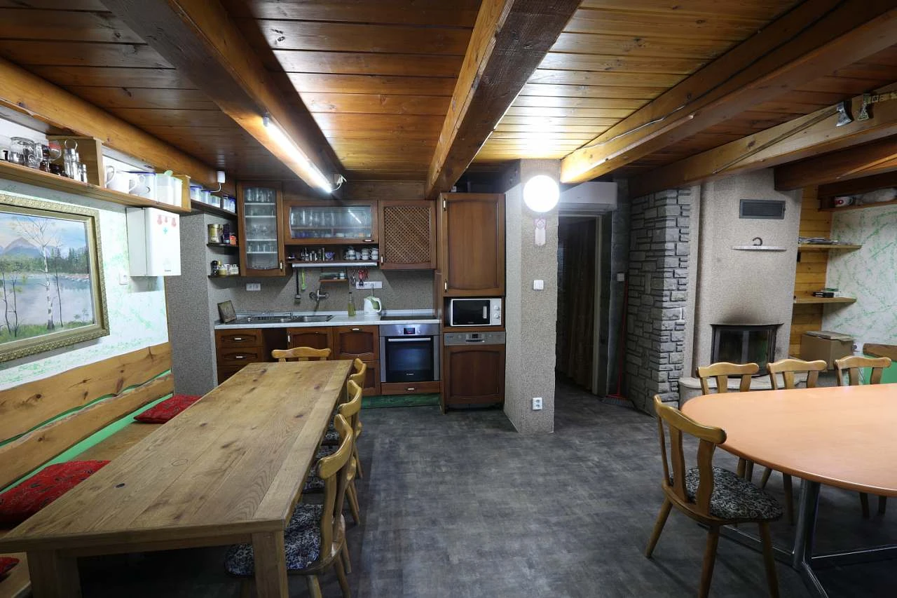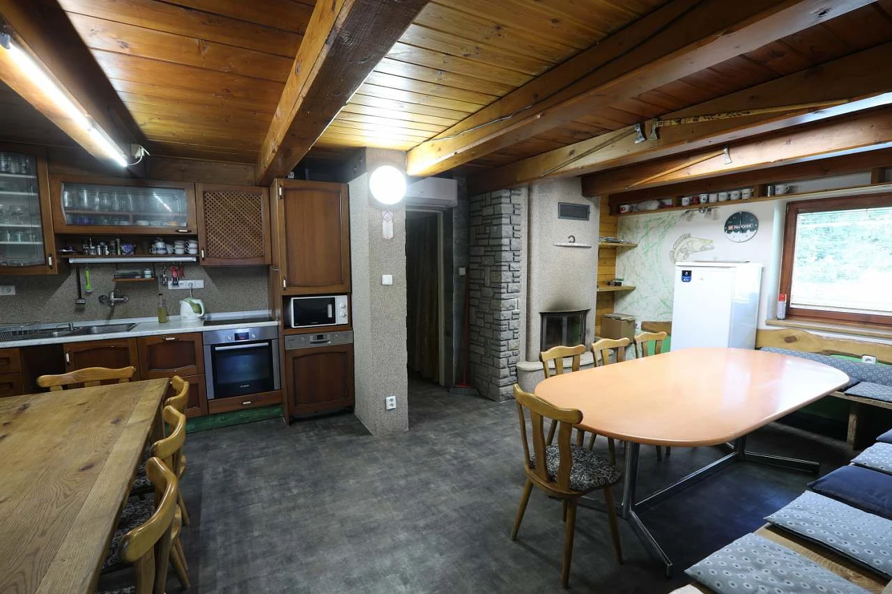 V dolní části chaty naleznete vše potřebné pro pohodlné posezení - krb, stoly s židlemi, kuchyňský kout a lednici. Toto místo je ideální pro přípravu jídla a nápojů, ať už pro vnitřní posezení nebo venkovní grilování. U chaty je nově vybudovaná velká pergola s venkovním posezením a místem pro oheň.