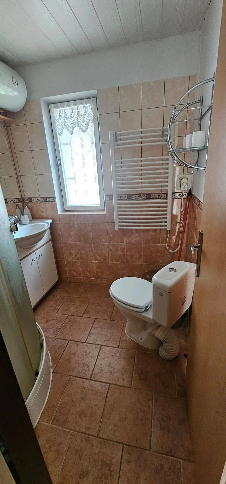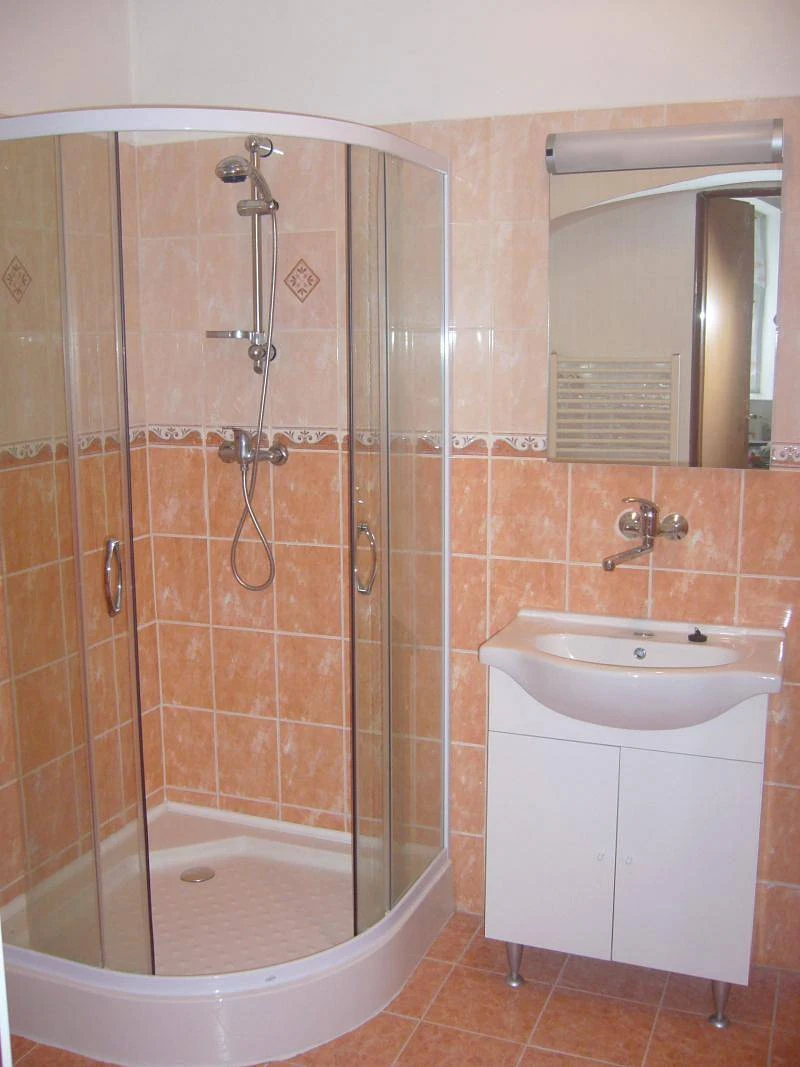 Jedna koupelna se sprchovým koutem, WC a umyvadlem.