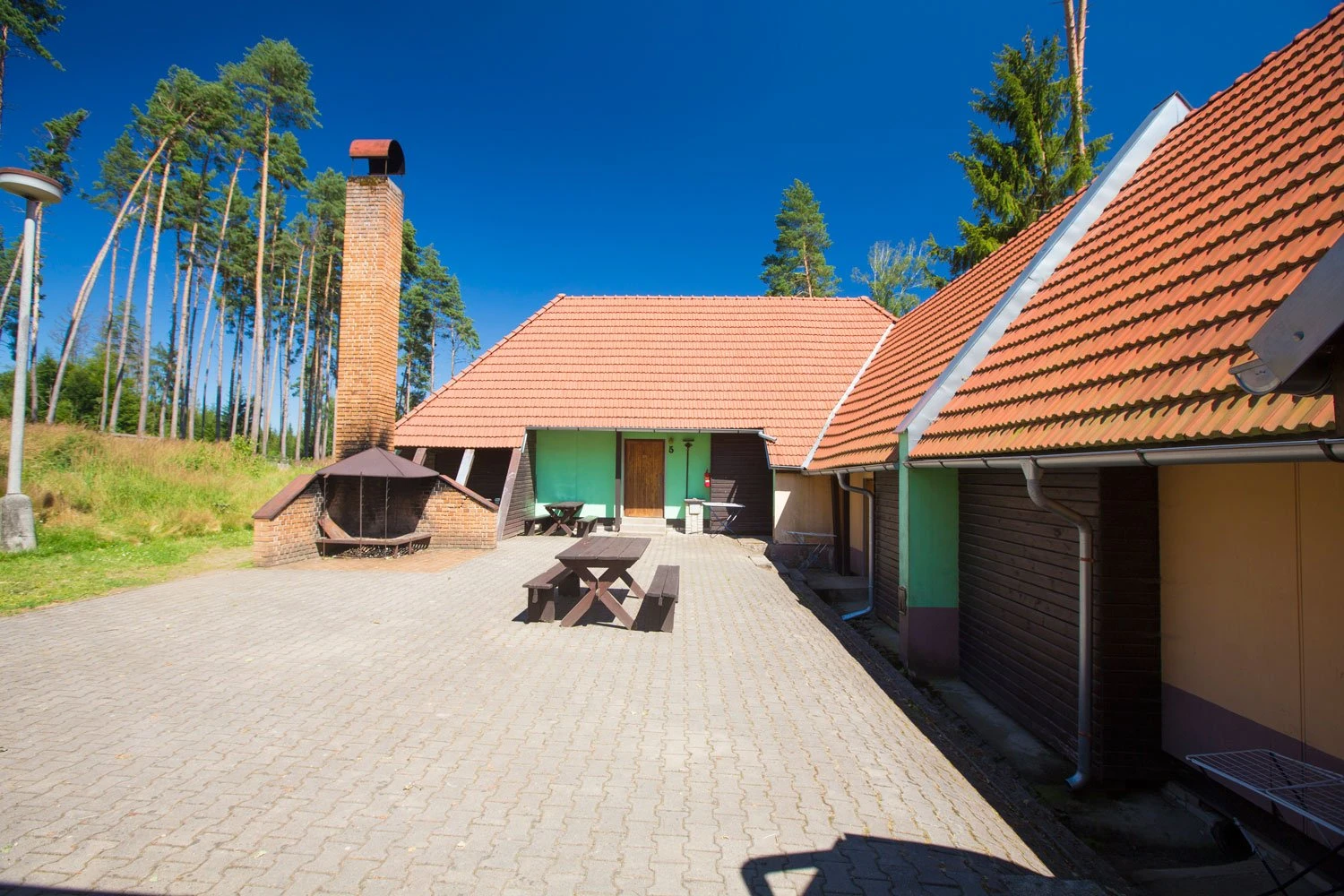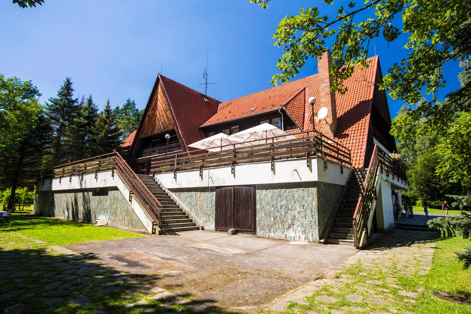 Přímo u jídelny je velká terasa s krbem.