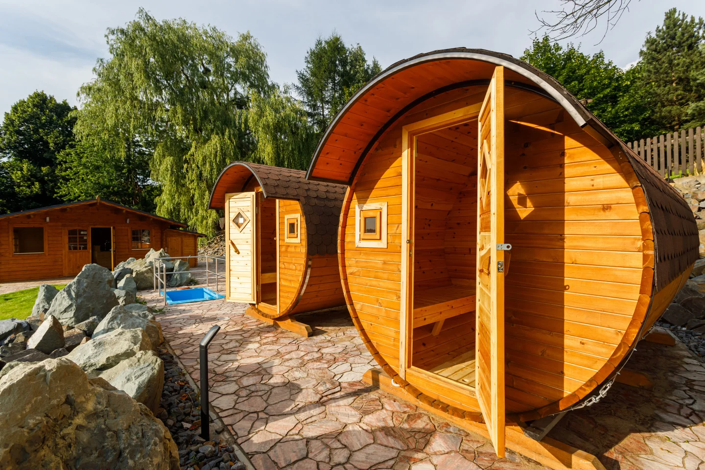 - Venkovní sudové sauny s krásným výhledem do přírody.