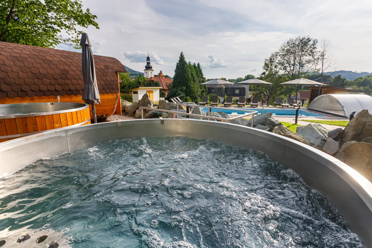 - Relaxace pod širým nebem v teplé vodě.