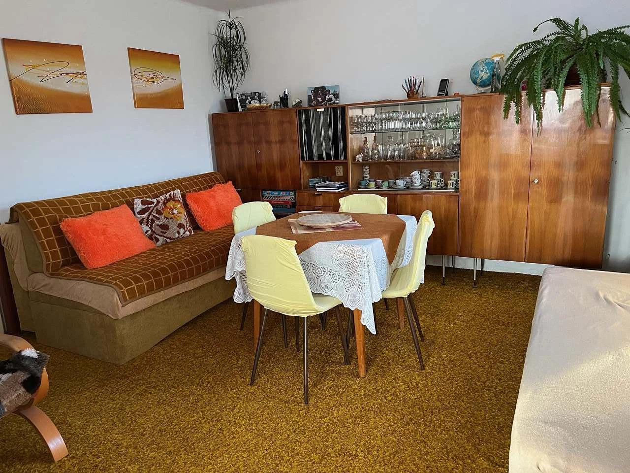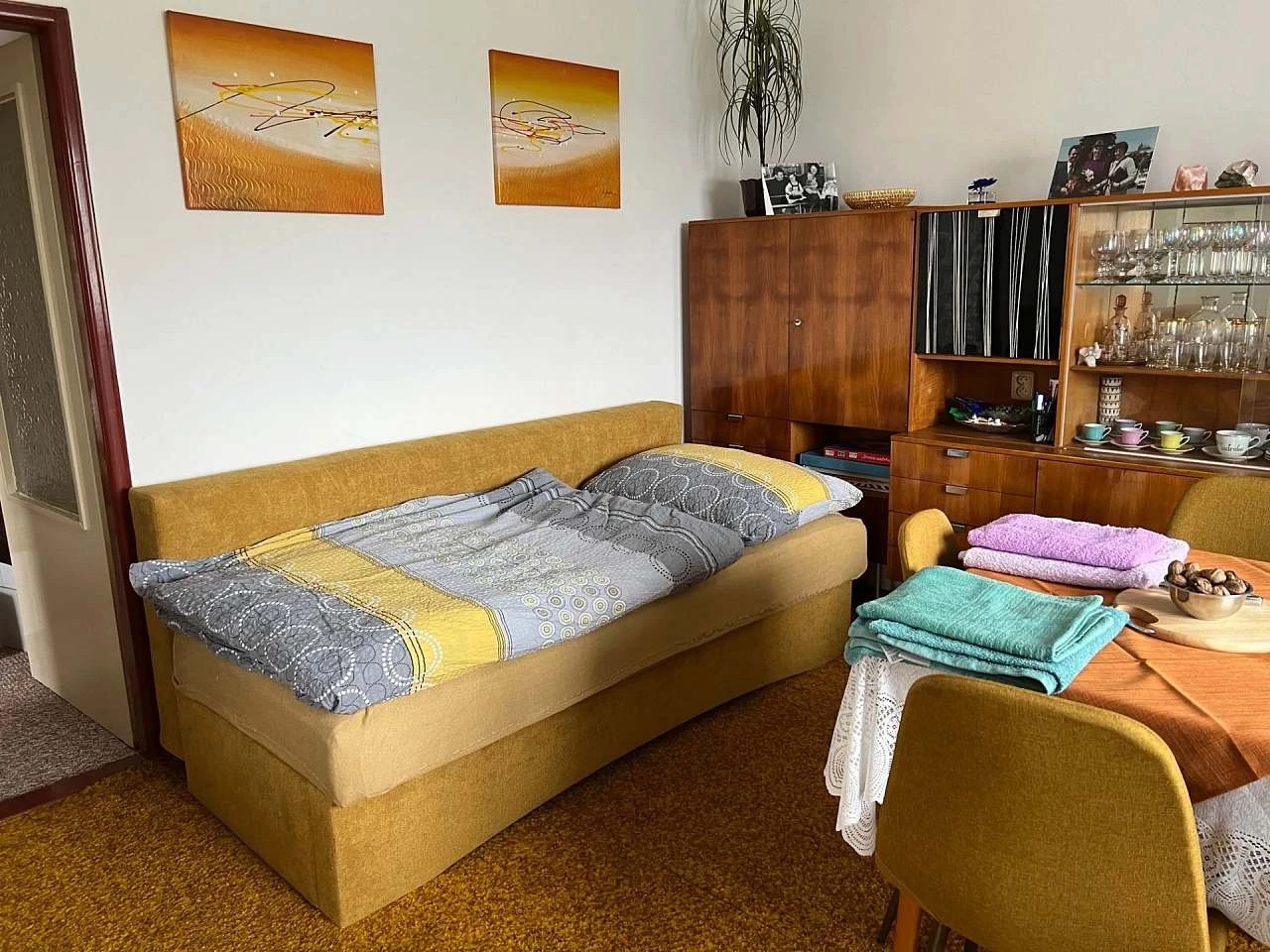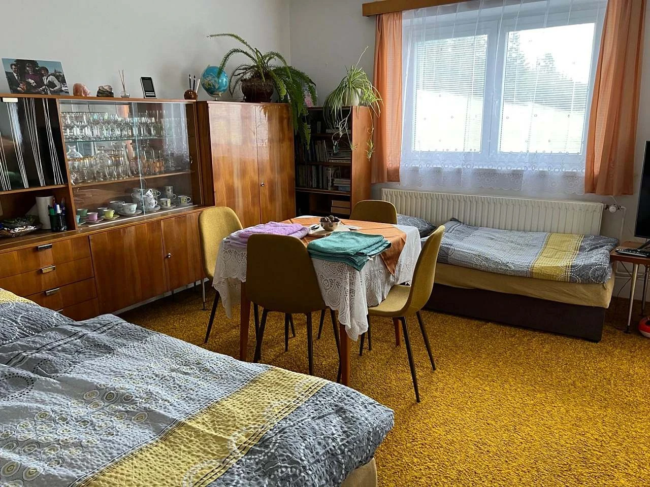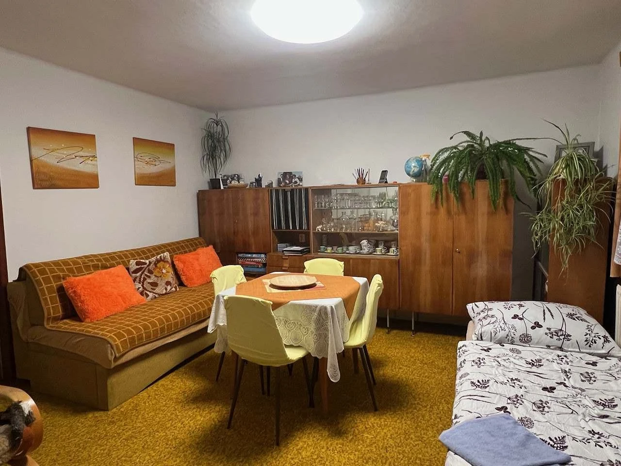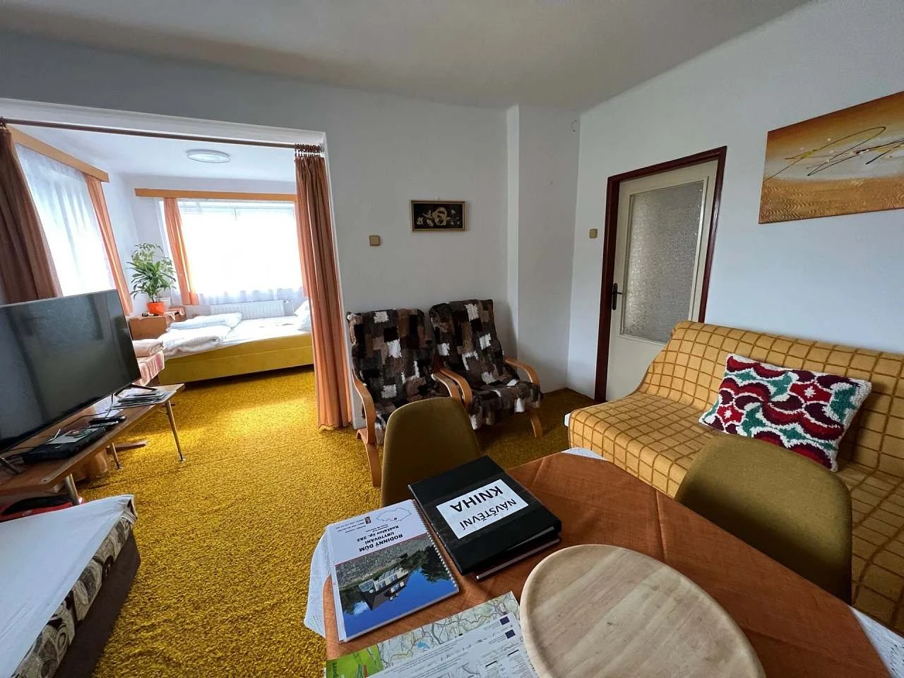 Přízemí s obývacím pokojem a kuchyní | až 4 osoby | od 700 Kč / osoba (4+ nocí, léto) | Obývací pokoj s rozkládacím gaučem, postelí a koutkem se 2 lůžky |