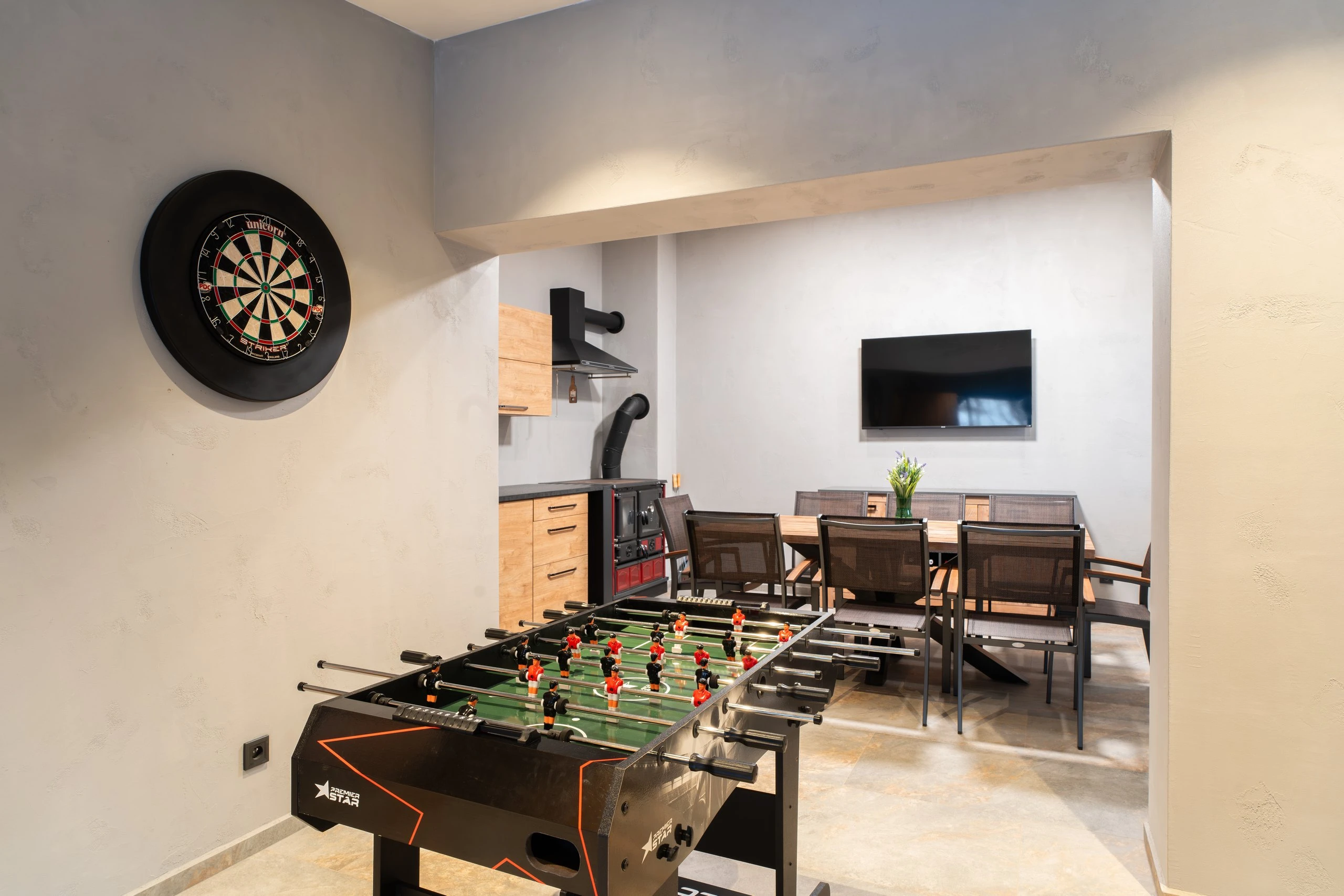 Televize, šipky, stolní fotbal, vinotéka