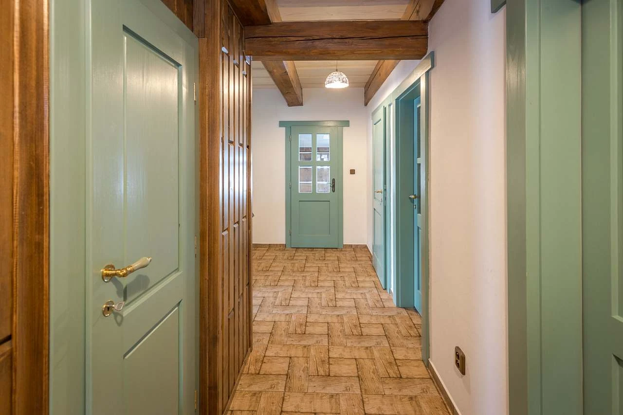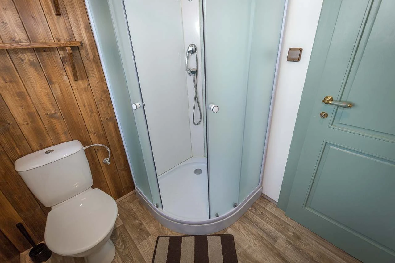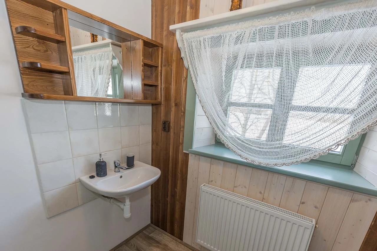 Chalupa nabízí dvě koupelny v patře (sprchový kout a WC) přístupné z pokojů, v přízemí je další koupelna s vanou, umyvadlem a sauna. Samostatné WC je rovněž v přízemí. Vytápění je řešeno elektrokotlem a krbovou vložkou.